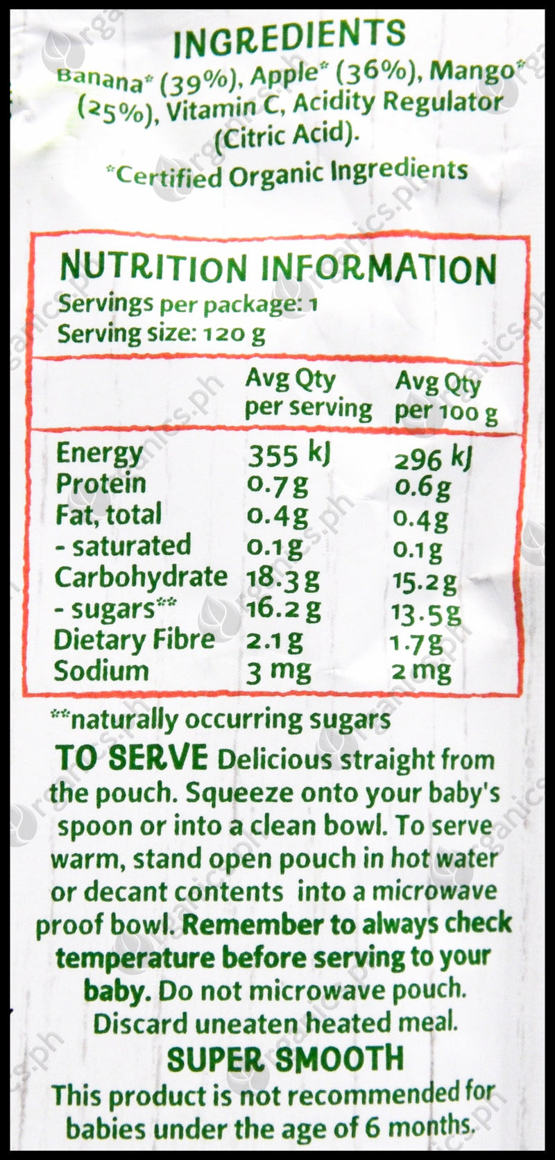 Delicious straight from the pouch. Squeeze onto your baby's spoon or into a clean bowl. To serve warm, stand open pouch in hot water or decant contents into a microwave proof bowl.