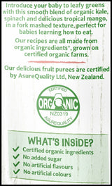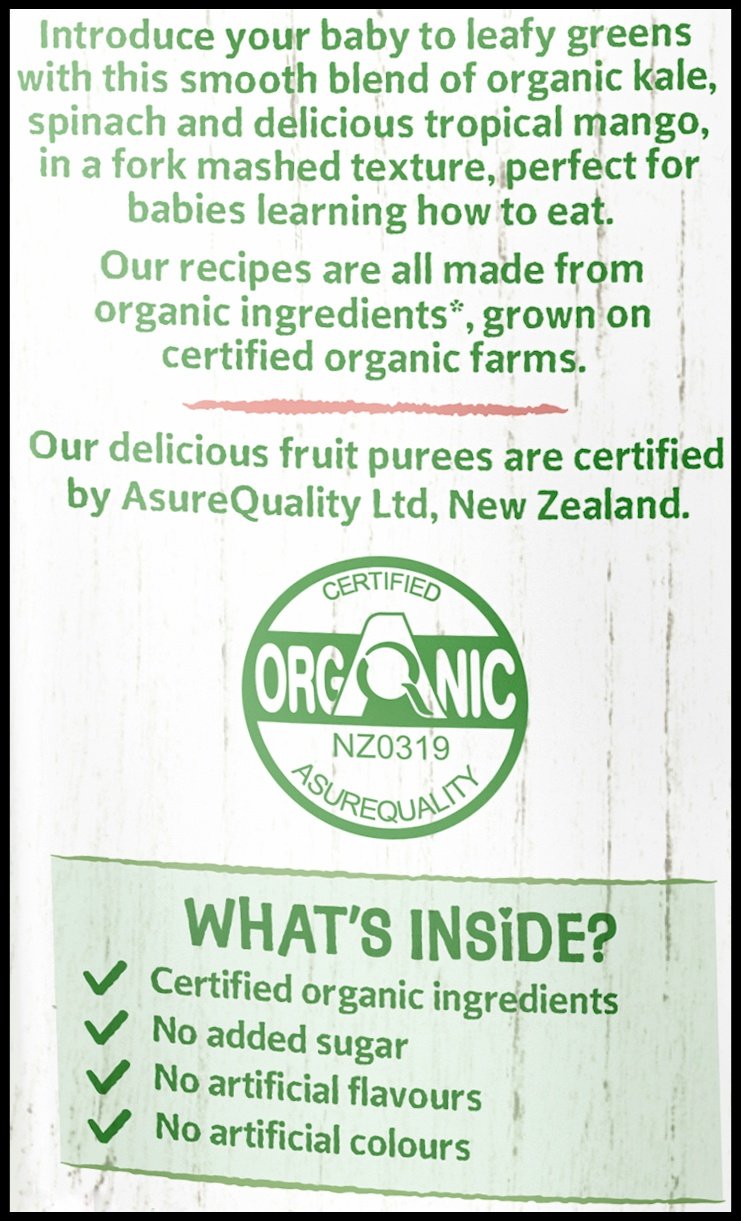 - Introduce your baby to leafy greens with this smooth blend of organic kale, spinach and delicious mango, in a fork mashed texture, perfect for babies learning how to eat.