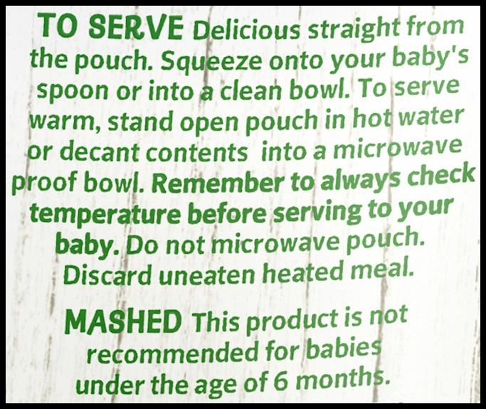 Delicious straight from the pouch. Squeeze onto your baby's spoon or into a clean bowl. To serve warm, stand open pouch in hot water or decant contents into a microwave proof bowl.