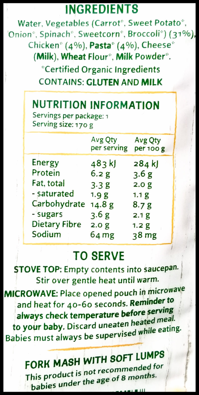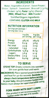Water, Vegetables (Carrots*, Sweet Potato*, Onion*, Spinach*, Sweetcorn*, Broccoli*) (31%), Chicken*(4%), Pasta (4%), Cheese* (Milk), Wheat Flour*, Milk Powder*.