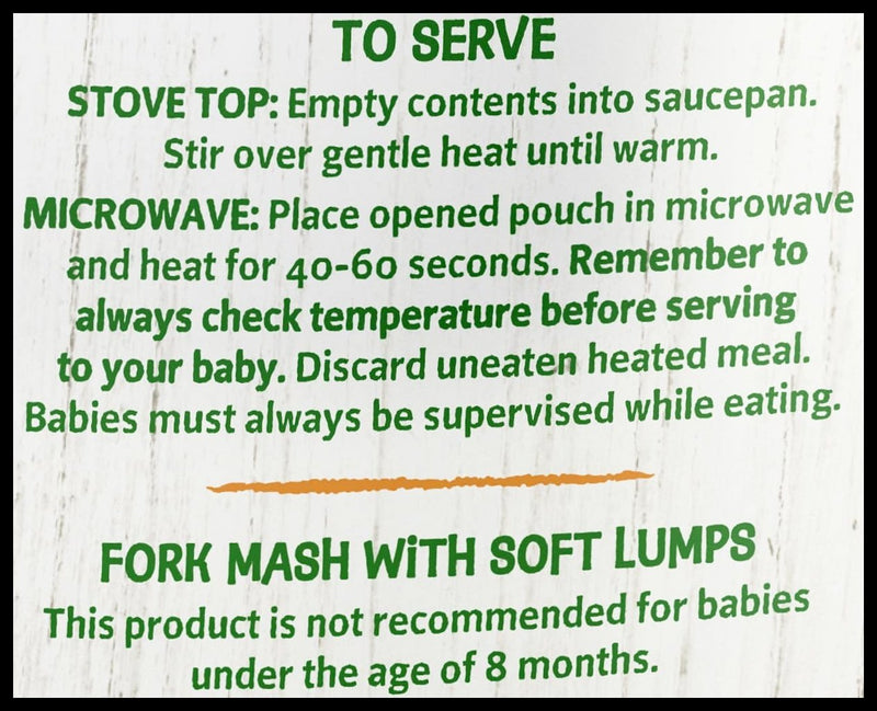 MICROWAVE: Place opened pouch in microwave and heat for 40-60 seconds. Remember to always check temperature before serving to your baby. Discard uneaten heated meal. Babies must always be supervised while eating.