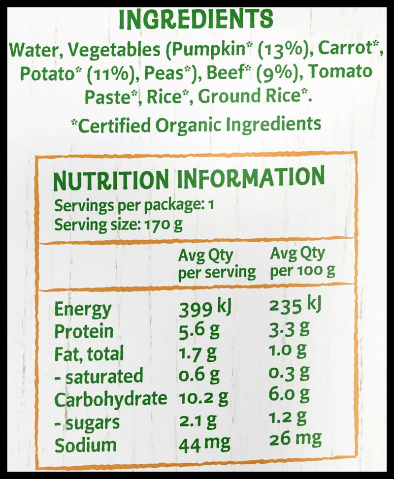 Water, Vegetables (Pumpkin* (13%), Carrot*, Potato* (11%), Peas*), Beef* (9%), Tomato Paste*, Rice*, Ground Rice*
