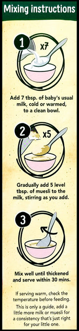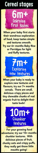 - Our organic baby muesli cereal is an exciting new taste sensation for little learners made with real fruit pieces, puffed rice and wholegrain oat flakes. Perfect for growing taste buds and getting little mouths really chewing!