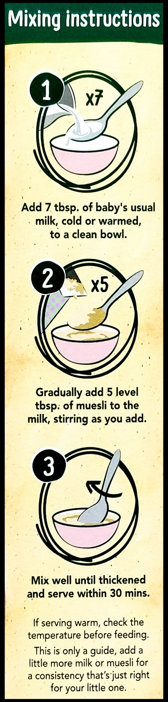 There are instructions on the box on how to make up Organix cereals. Use your baby's usual milk. Pour the suggested amount of milk into a clean bowl, sprinkle the cereal into the milk and mix thoroughly to prevent any lumps. Remember though that the preparation instructions are only a guideline, don't be worried about adding a little more milk or cereal to get a consistency that is just right for your little one. The amount of cereal you use depends on your baby's appetite. As your baby grows their appetite will too, so gradually increase the amount of cereal accordingly. If you use warm milk, you probably won’t need as much cereal as when you use cold milk. Always check the temperature of the cereal before you feed your baby.