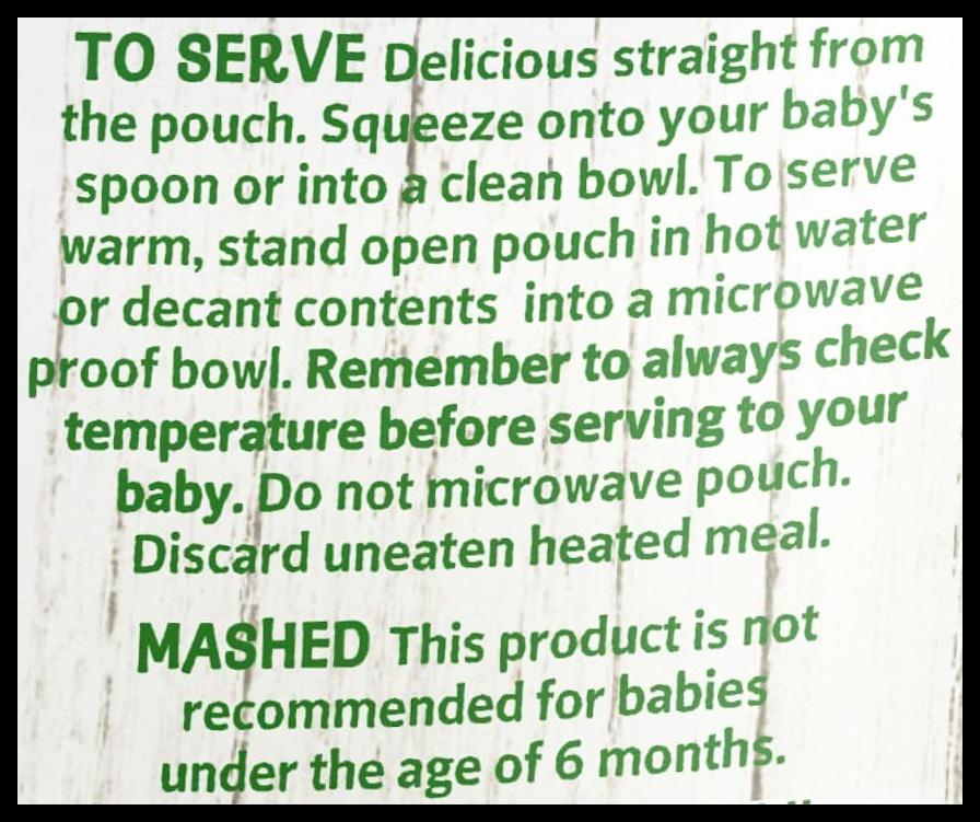 Delicious straight from the pouch. Squeeze onto your baby's spoon or into a clean bowl. To serve warm, stand open pouch in hot water or decant contents into a microwave proof bowl.