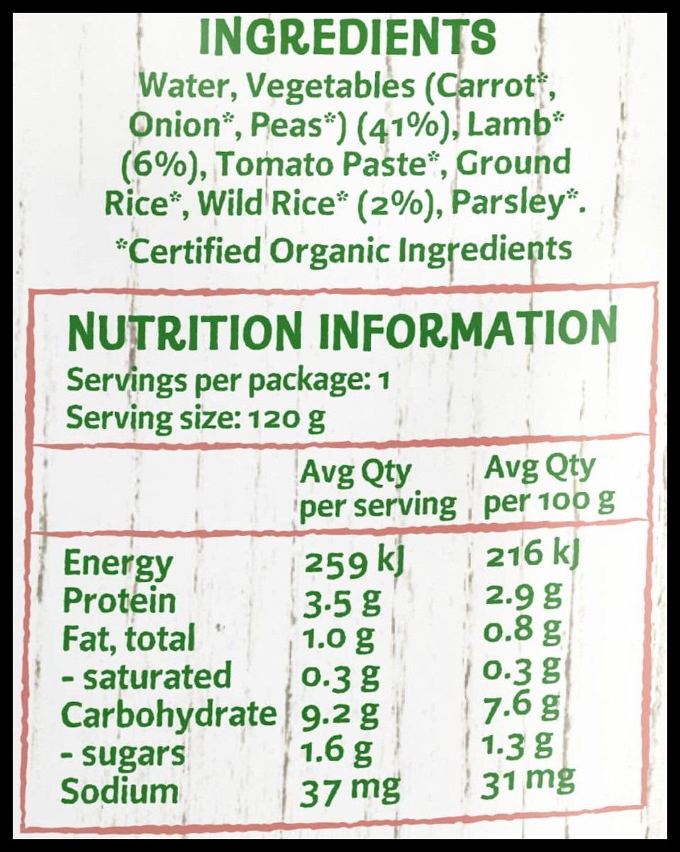 Water, Vegetables (Carrot*, Onion*, Peas*) (41%), Lamb* (6%), Tomato Paste*, Ground Rice*, Wild Rice* (2%), Parsley*.
