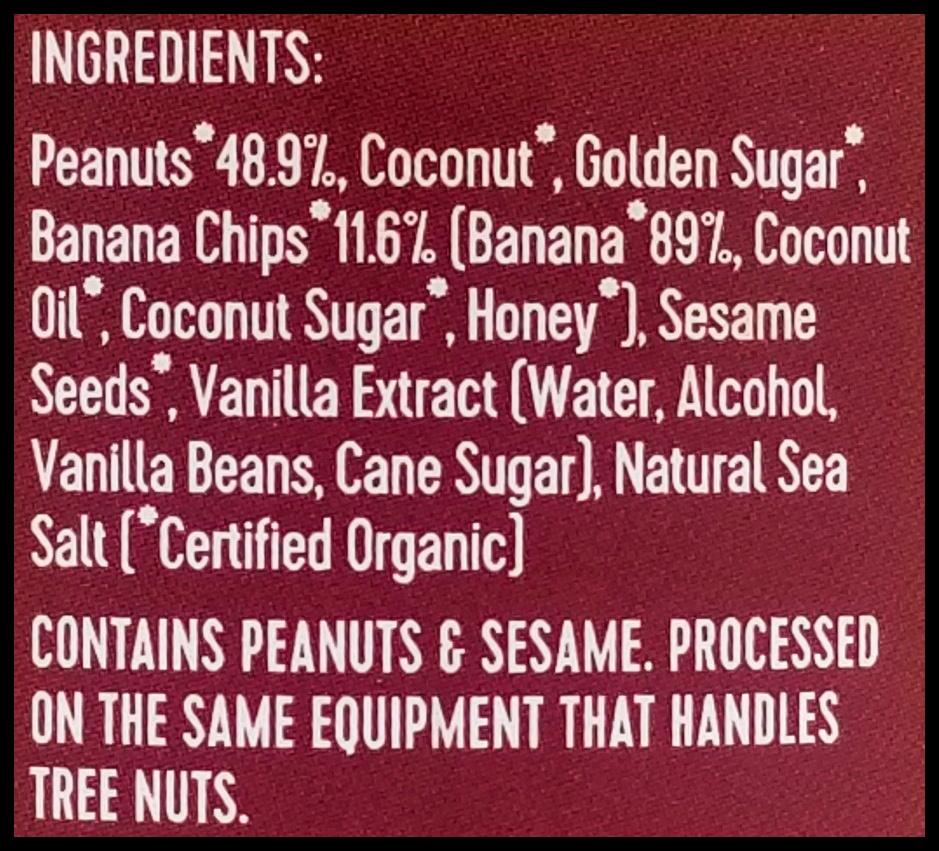 Peanuts* 48.9%, Coconut*, Golden Sugar*, Banana Chips* 11.6% (Banana* 89%, Coconut Oil*, Coconut Sugar*, Honey*), Sesame Seeds*, Vanilla Extract (Water, Alcohol, Vanilla Beans, Cane Sugar), Natural Sea Salt (*Certified Organic).