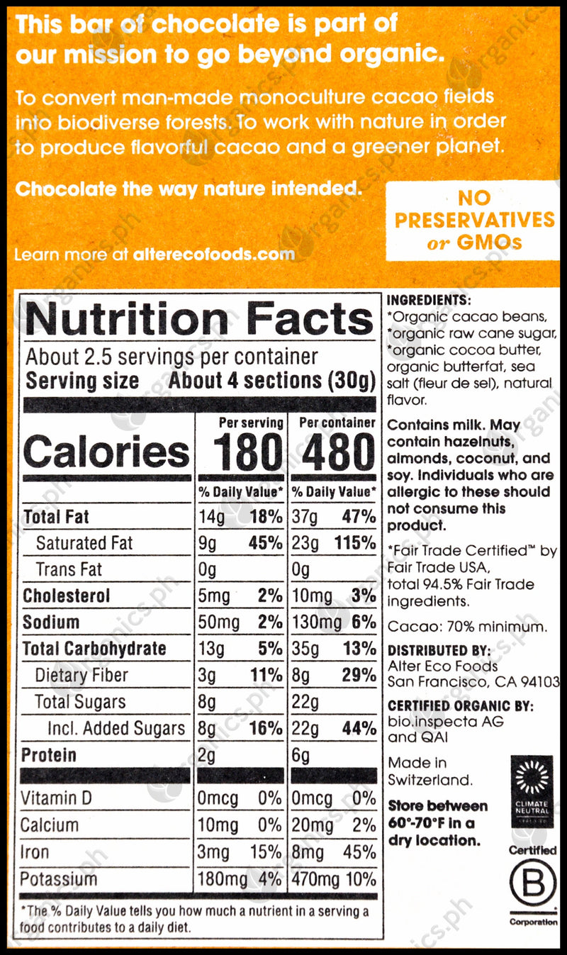 Organic cacao beans, organic raw cane sugar, organic cocoa butter, organic butterfat, sea salt (fleur de sel), natural flavor.