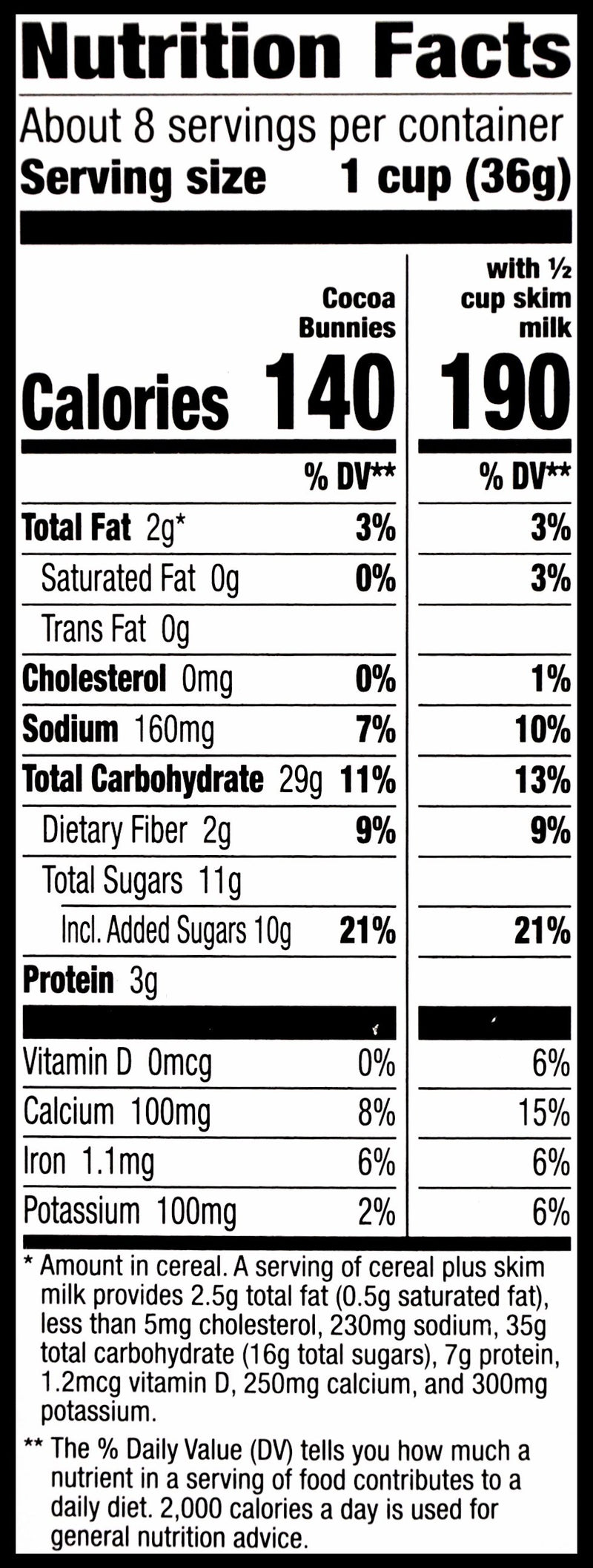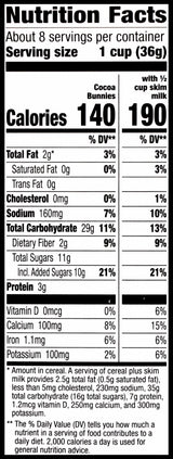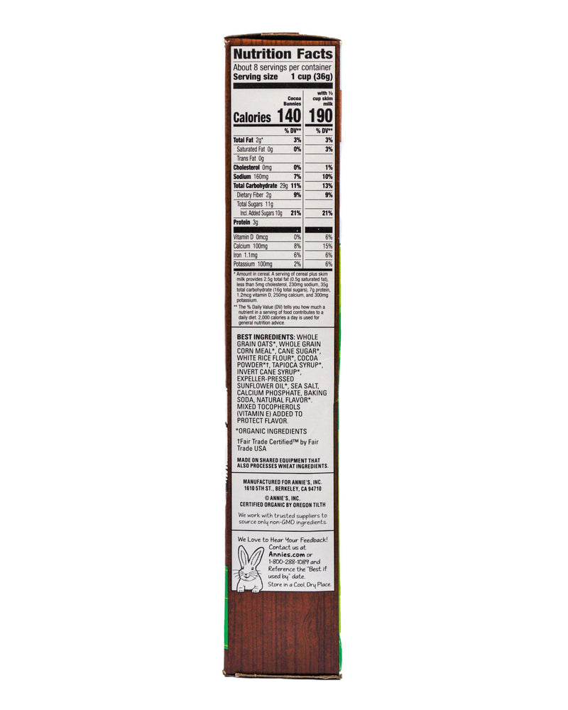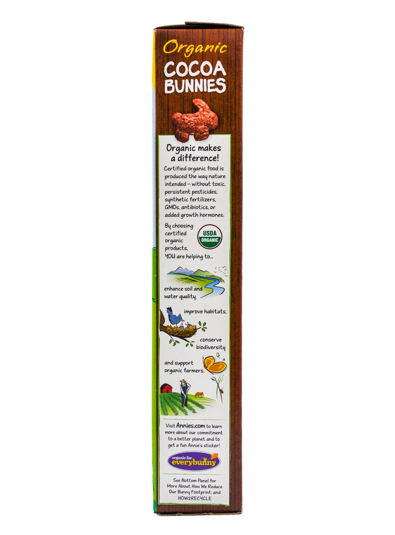 - Our Organic Cocoa Bunnies Cereal is a scrumptious oat, corn and rice cereal with crunchy cocoa goodness packed into every bite. We source organic Fair Trade Certified cocoa for extra goodness, and our bunnies are certified organic, making them a sweet spot parents and kids can agree on for breakfast & beyond.