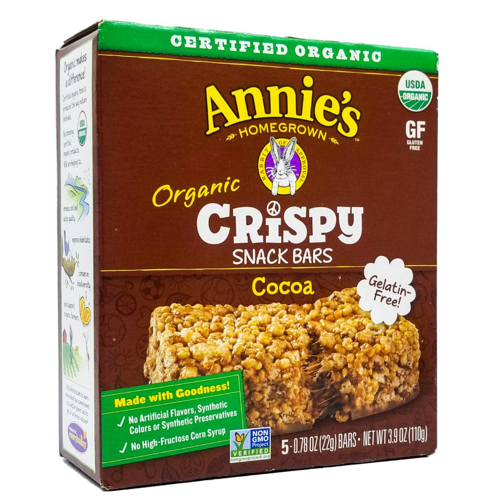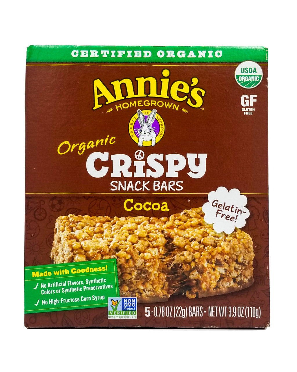 - We did it! We took your family’s favorite treat, cleaned it up, and wrapped it in cocoa for a sweet treat on the go. No gelatin here, just crispy, chocolatey, organic YUM for everybunny. Our Organic Cocoa Crispy Snack Bars are naturally gluten free and made without gelatin. So toss one in the lunch box for a hoppy afternoon treat, or anytime you need that quick yum fix.
