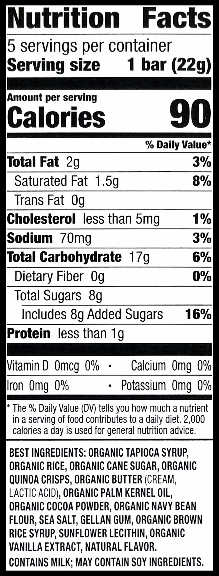 Organic Tapioca Syrup, Organic Rice, Organic Cane Sugar, Organic Quinoa Crisps, Organic Butter (Cream, Lactic Acid), Organic Palm Kernel Oil, Organic Cocoa Powder, Organic Navy Bean Flour, Sea Salt, Gellan Gum, Organic Brown Rice Syrup, Sunflower Lecithin, Organic Vanilla Extract, Natural Flavor.