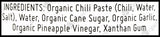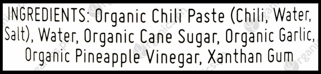 Organic Chili Paste (Chili, Water, Salt), Water, Organic Cane Sugar, Organic Garlic, Organic Pineapple Vinegar, Xanthan Gum (0.80%).