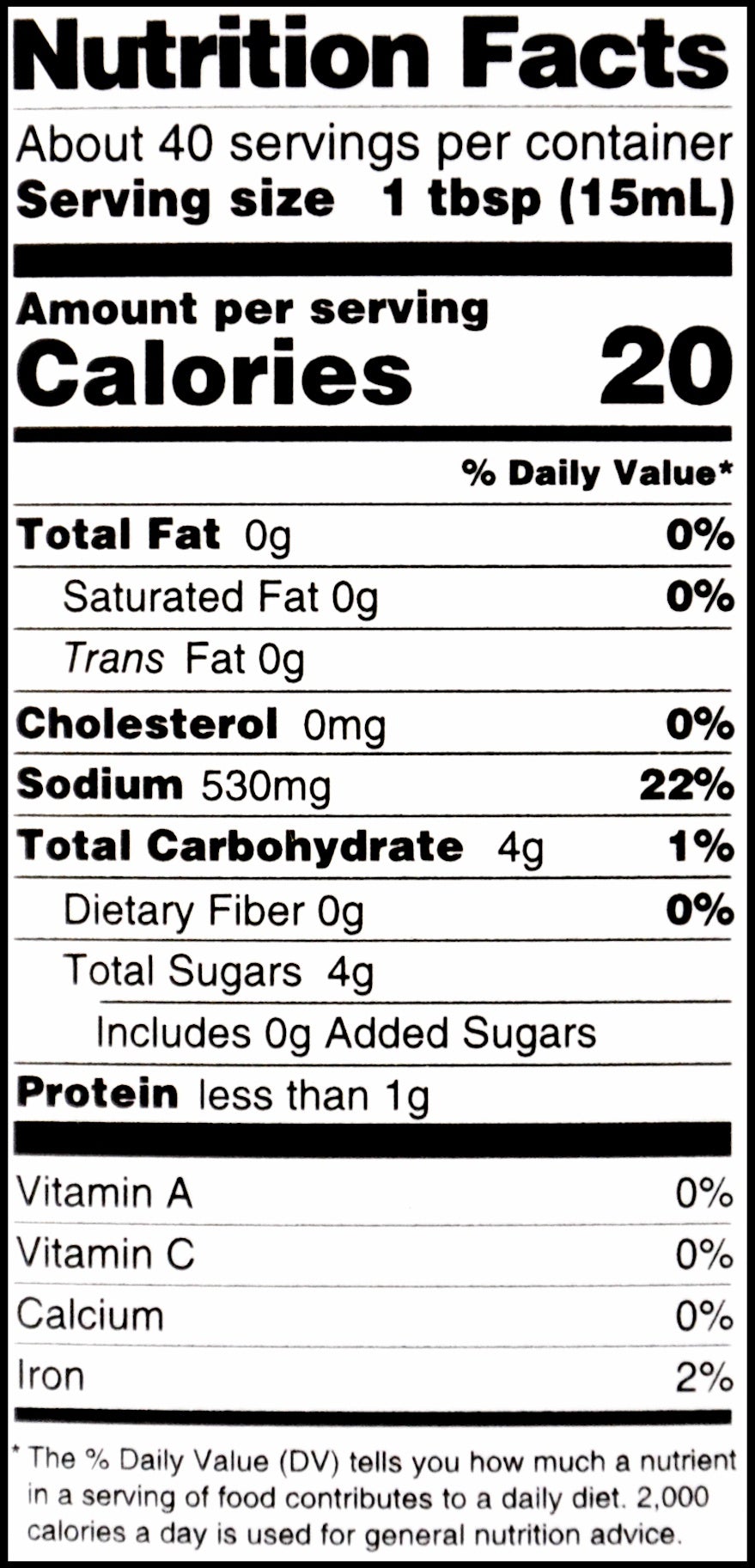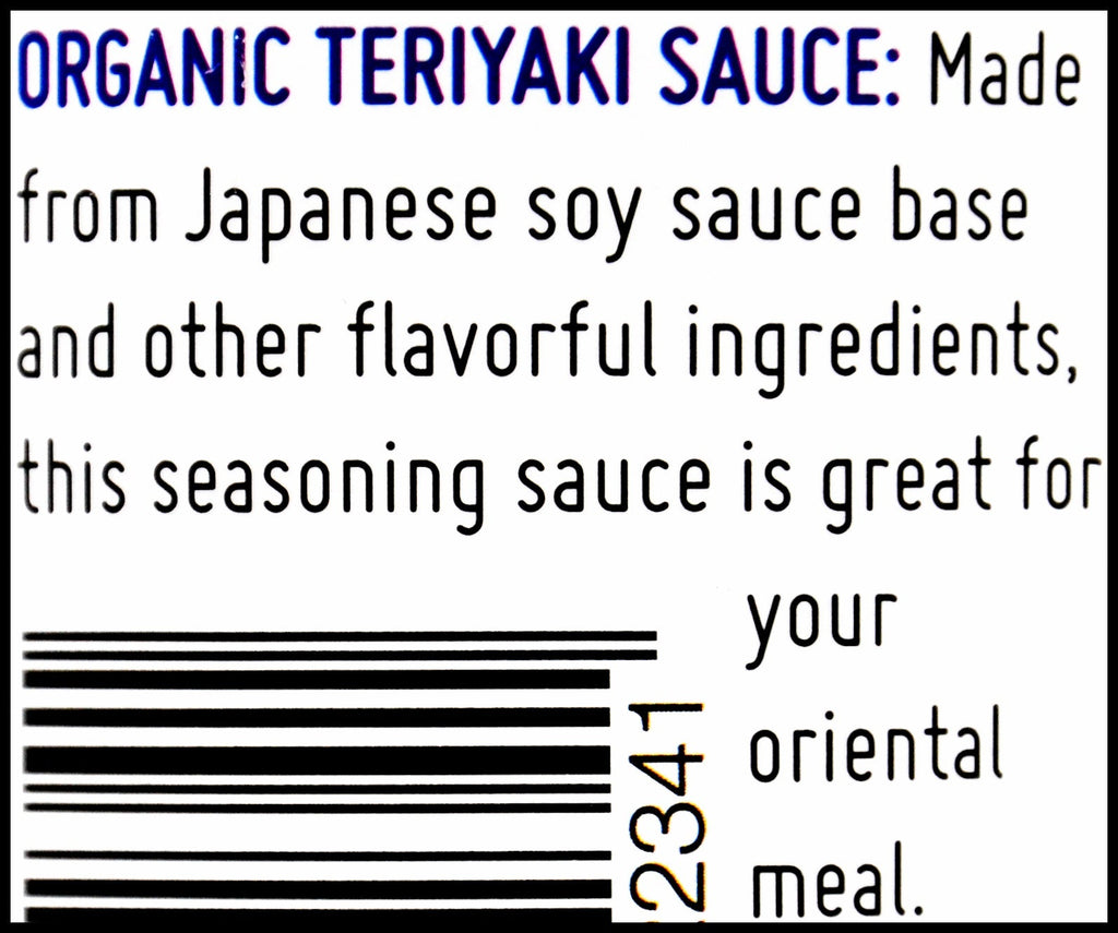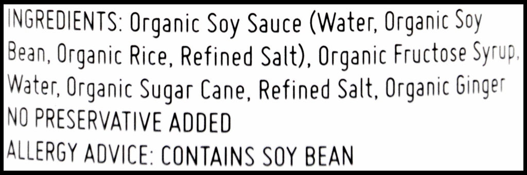 Organic soy sauce (water, organic soybean, organic rice, refined salt), Organic fructose syrup (water, organic sugar cane, refined salt), Organic ginger.