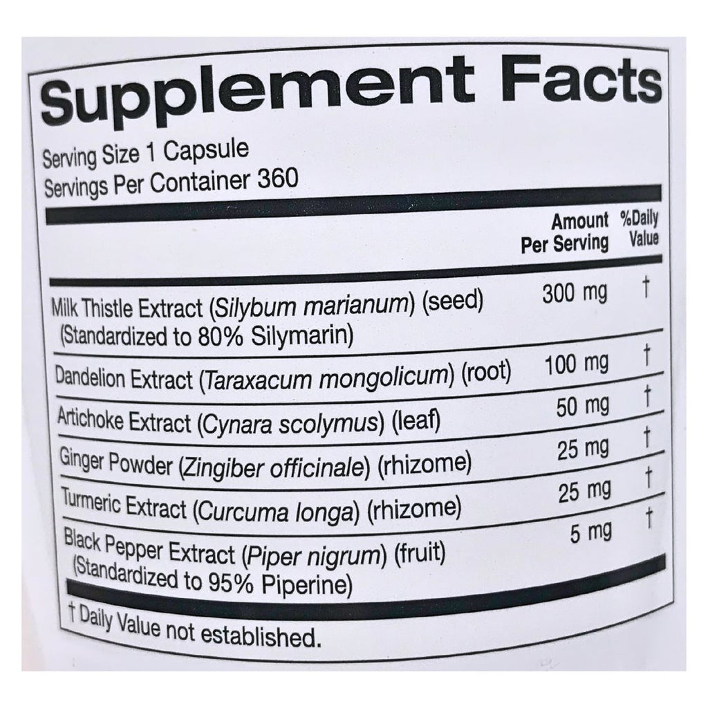 Milk Thistle Extract (Silybum marianum) (seed) (Standardized to 80% Silymarin), Dandelion Extract (Taraxacum mongolicum) (root), Artichoke Extract (Cynara scolymus) (leaf),Turmeric Extract (Curcuma longa) (rhizome), Ginger Powder (Zingiber officinale) (rhizome), Black Pepper Extract (Piper nigrum) (fruit) (Standardized to 95% Piperine)