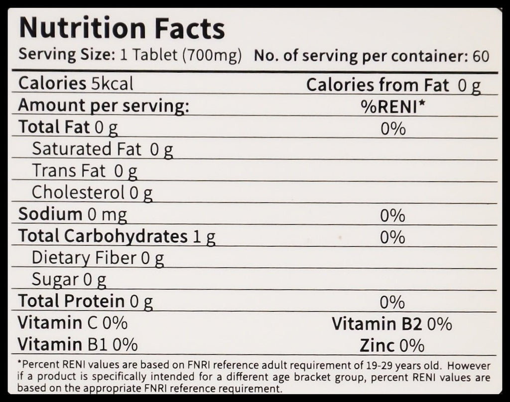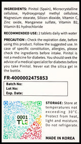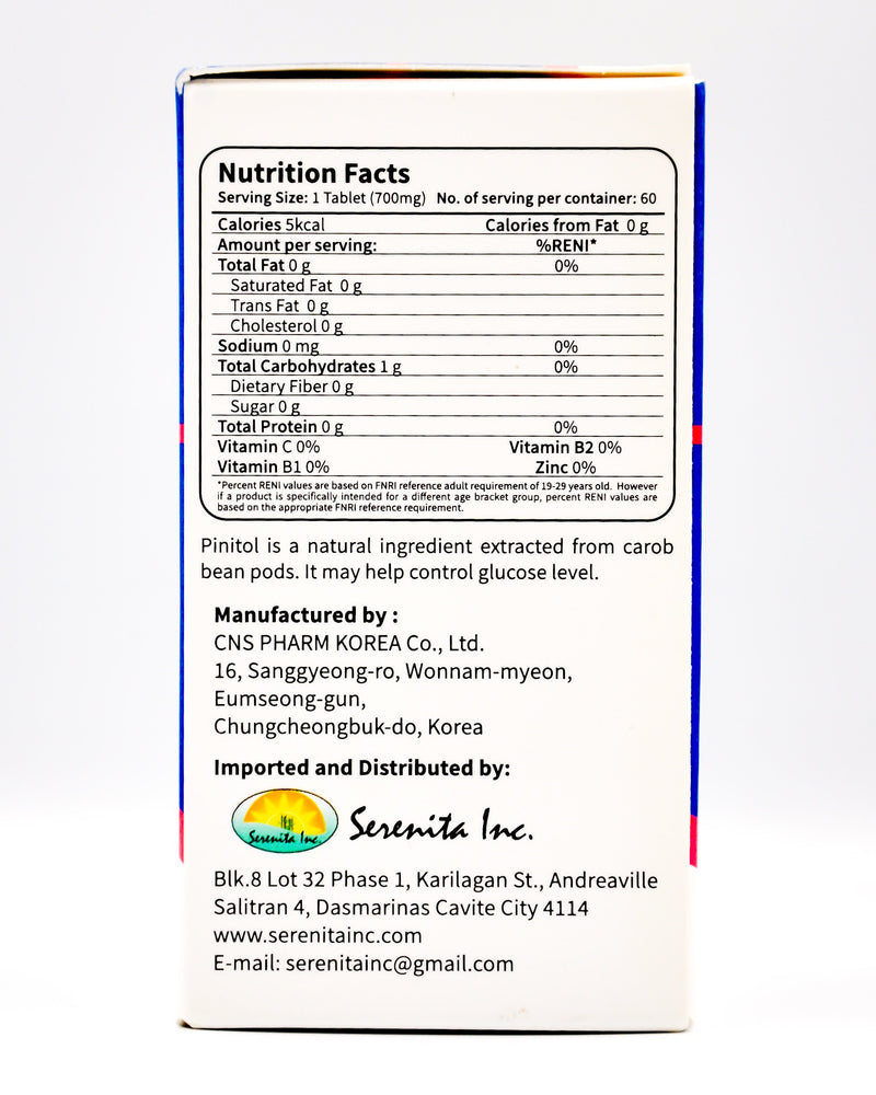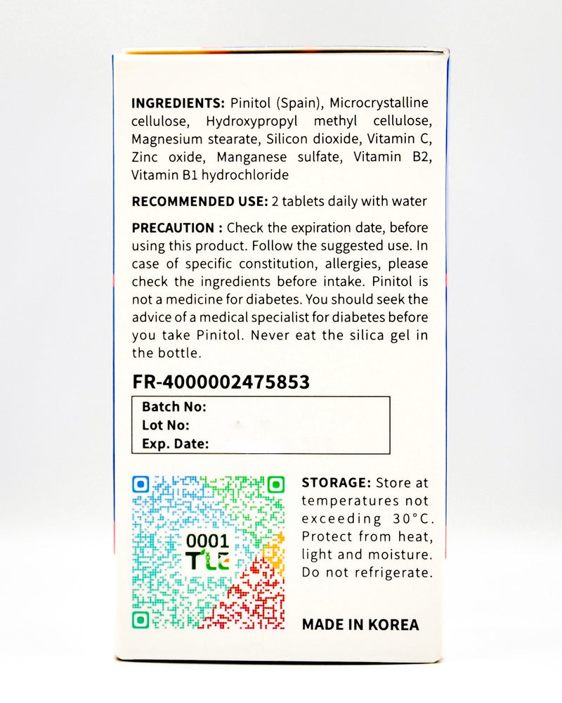 Pinitol (Spain), Microcrystalline Cellulose, Hydroxypropyl Methyl Cellulose, Magnesium Stearate, Silicon Dioxide, Vitamin C, Zinc Oxide, Manganese Sulfate, Vitamin B2, Vitamin B1 Hydrochloride.