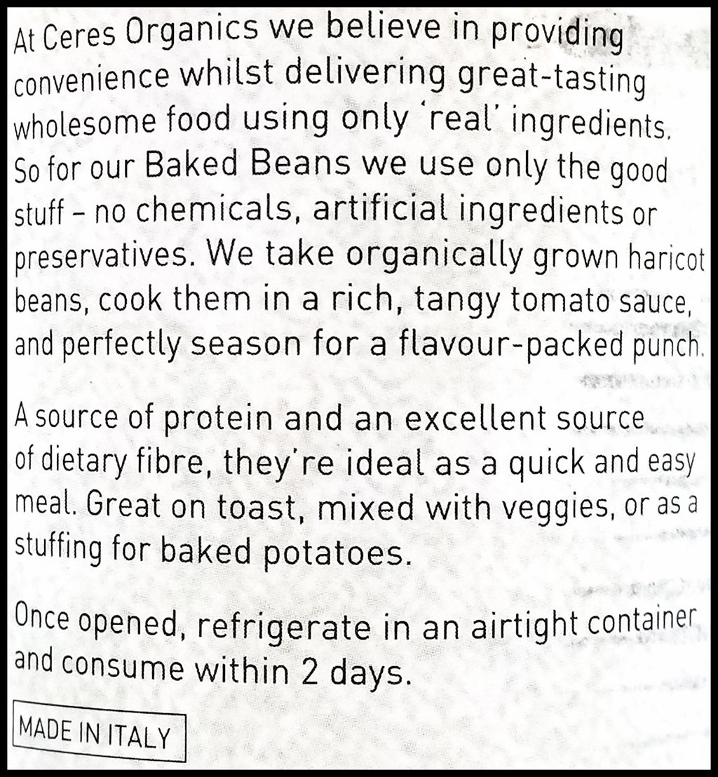 • Ceres Organics Baked Beans are made with organically grown haricot beans, cooked in a rich, tangy tomato sauce, and perfectly seasoned for a flavor-packed punch. You’ll find nothing artificial here-no flavor enhancers, additives or preservatives. Just real ingredients and real good flavor.