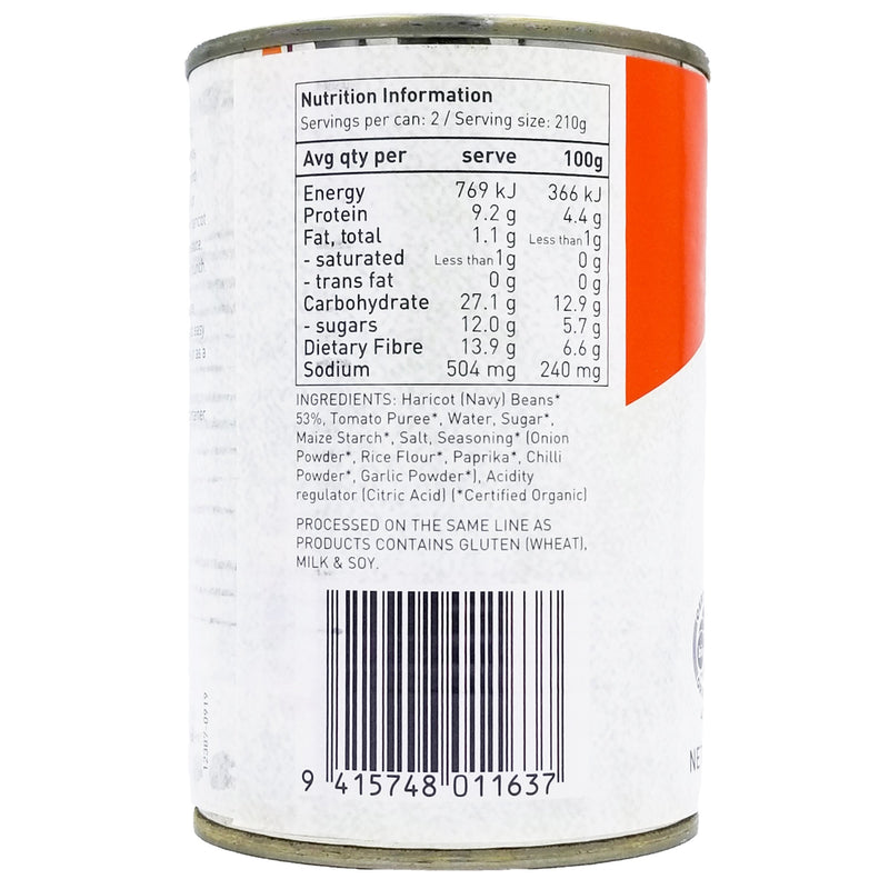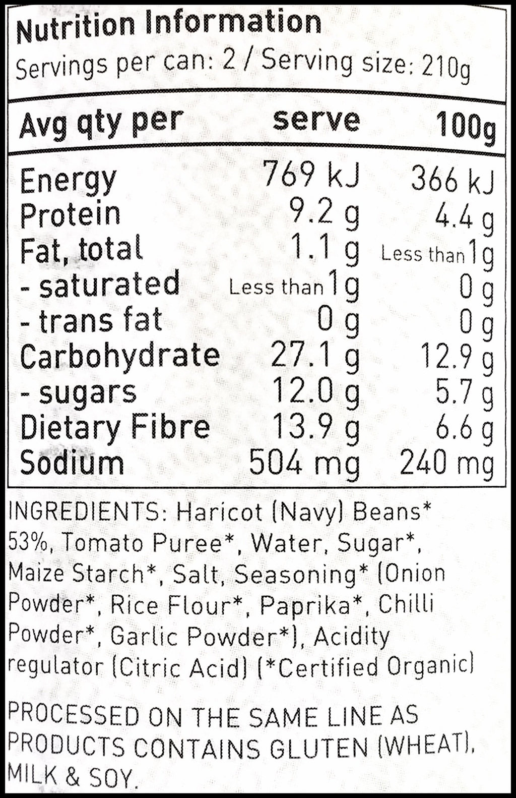 Haricot Beans*, Tomato Puree*, Water, Sugar*, Maize Starch* , Salt, Onion Powder*, Rice Flour*, Paprika*, Chilli Powder*, Garlic Powder*, Acidity Regulator (Citric Acid). (*Certified Organic).