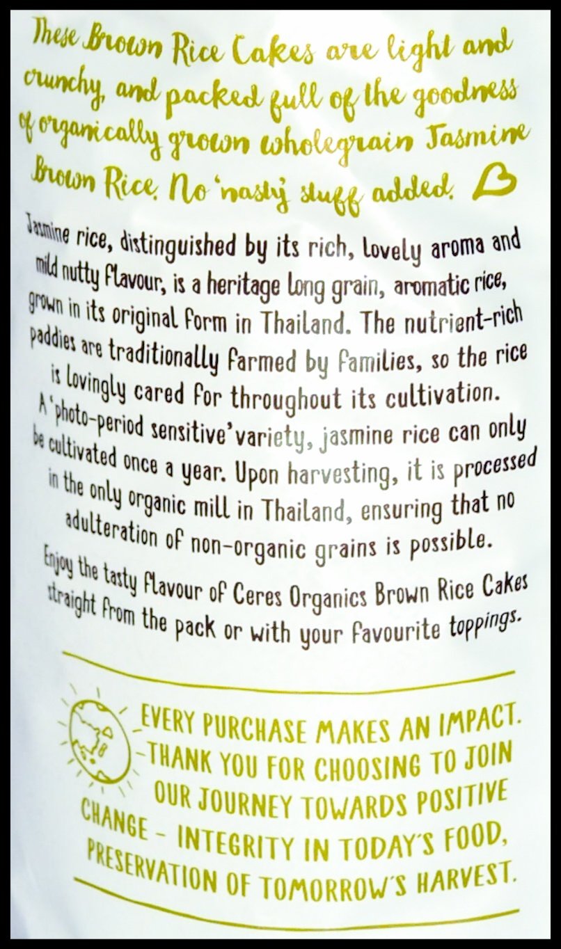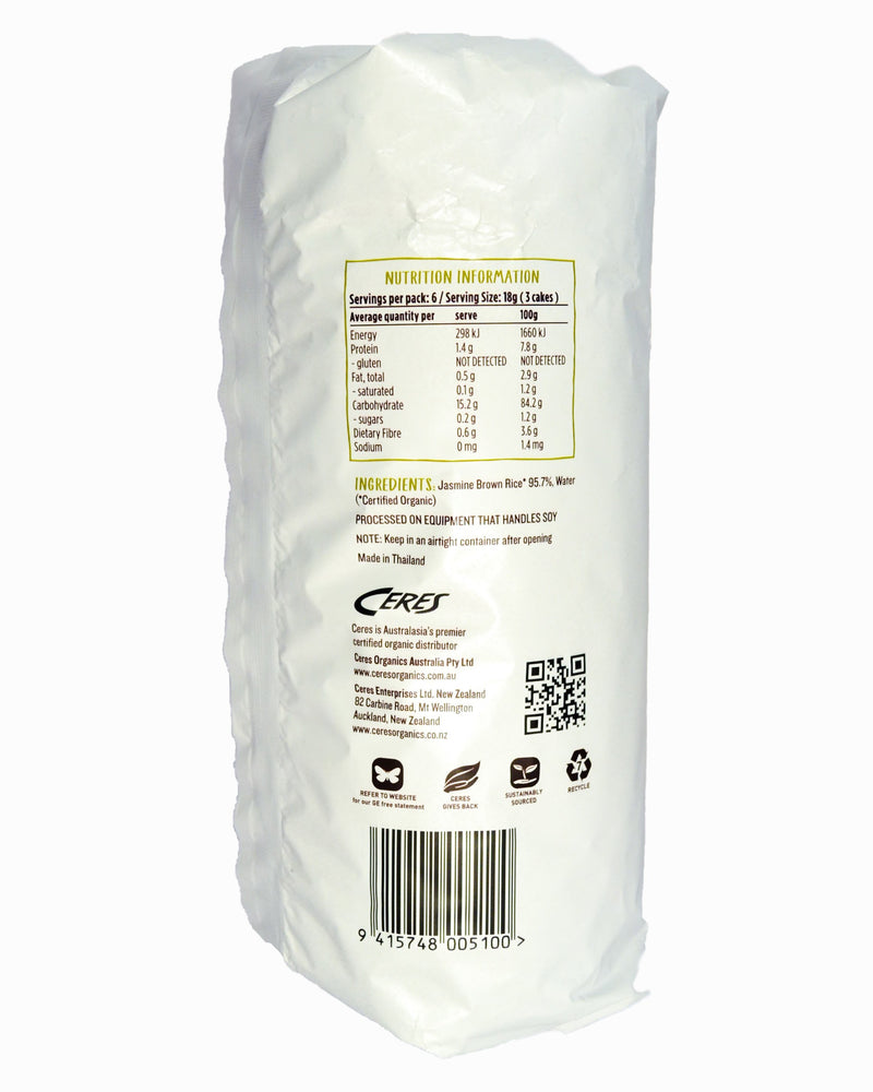 • These Brown Rice Cakes are light and crunchy, and packed full of the goodness of organically grown wholegrain Jasmine Brown Rice. No ‘nasty’ stuff added.