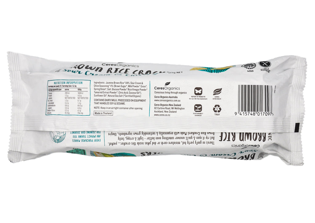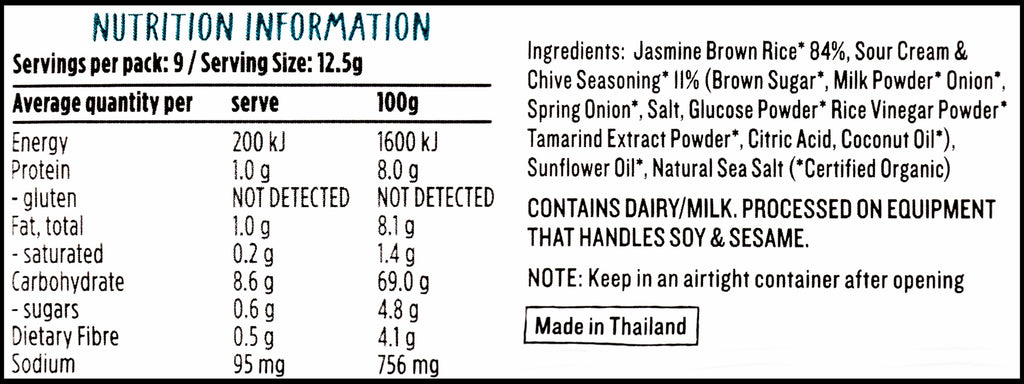 Jasmine Brown Rice*, Sour Cream & Chive Seasoning* (Brown Sugar*, Milk Powder* Onion*, Spring Onion*, Salt, Glucose Powder* Rice Vinegar Powder* Tamarind Extract Powder*, Citric Acid, Coconut Oil*), Sunflower Oil*, Natural Sea Salt (*Certified Organic).