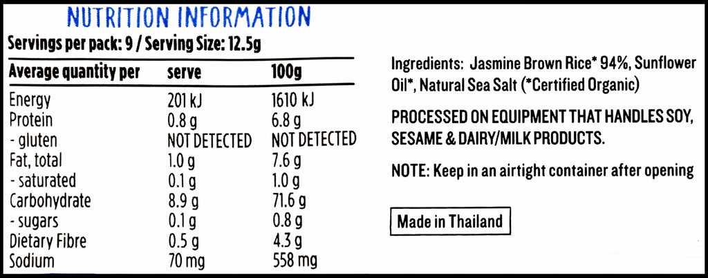 Jasmine Brown Rice*, Sunflower Oil*, Natural Sea Salt (*Certified Organic).