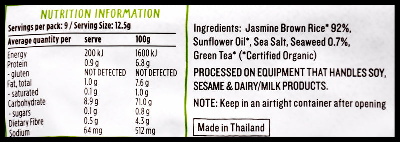 Jasmine Brown Rice* 92%, Sunflower Oil*, Green Tea*, Seaweed*, Natural Sea Salt (*Certified Organic).
