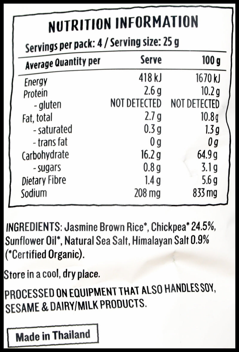 Jasmine Brown Rice*, Chickpea* 24.6%, Sunflower Oil*, Himalayan Salt 0.9%, Natural Sea Salt. (*Certified Organic).