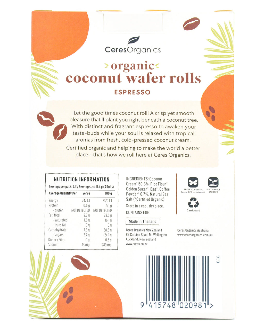 - Let the good times coconut roll! These Coconut Rolls are a crisp yet smooth pleasure that’ll plant you right beneath a coconut tree. Distinct and fragrant espresso will awaken your taste-buds while your soul is relaxed with tropical aromas from fresh, cold-pressed coconut cream. It’s a delicate balance awaiting your discovery. This unique snack is certified organic and helping to make the world a better place - that’s how we roll here at Ceres Organics.