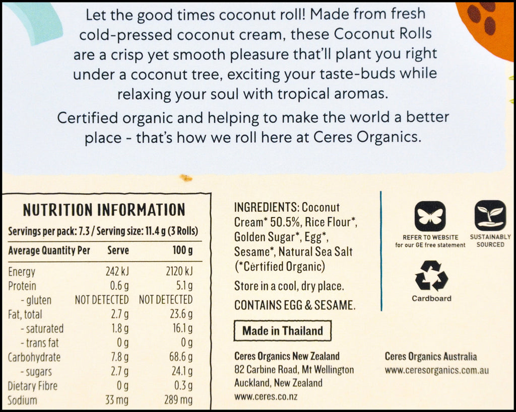 - Let the good times coconut roll! Made from fresh cold-pressed coconut cream, these Coconut Wafer Rolls are a crisp yet smooth pleasure that’ll plant you right under a coconut tree, exciting your taste-buds while relaxing your soul with tropical aromas. This unique snack is certified organic and helping to make the world a better place - that’s how we roll here at Ceres Organics.