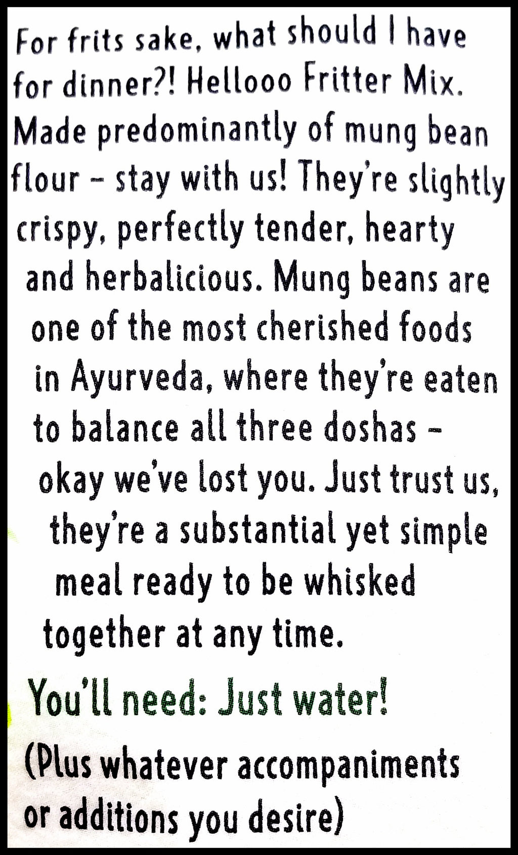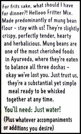 - Made predominantly of mung bean flour – stay with us! They’re slightly crispy, perfectly tender, hearty and herbalicious. Mung beans are one of the most cherished foods in Ayurveda, where they’re eaten to balance all three doshas – okay we’ve lost you. Just trust us, they’re a substantial yet simple meal ready to be whisked together at any time.
