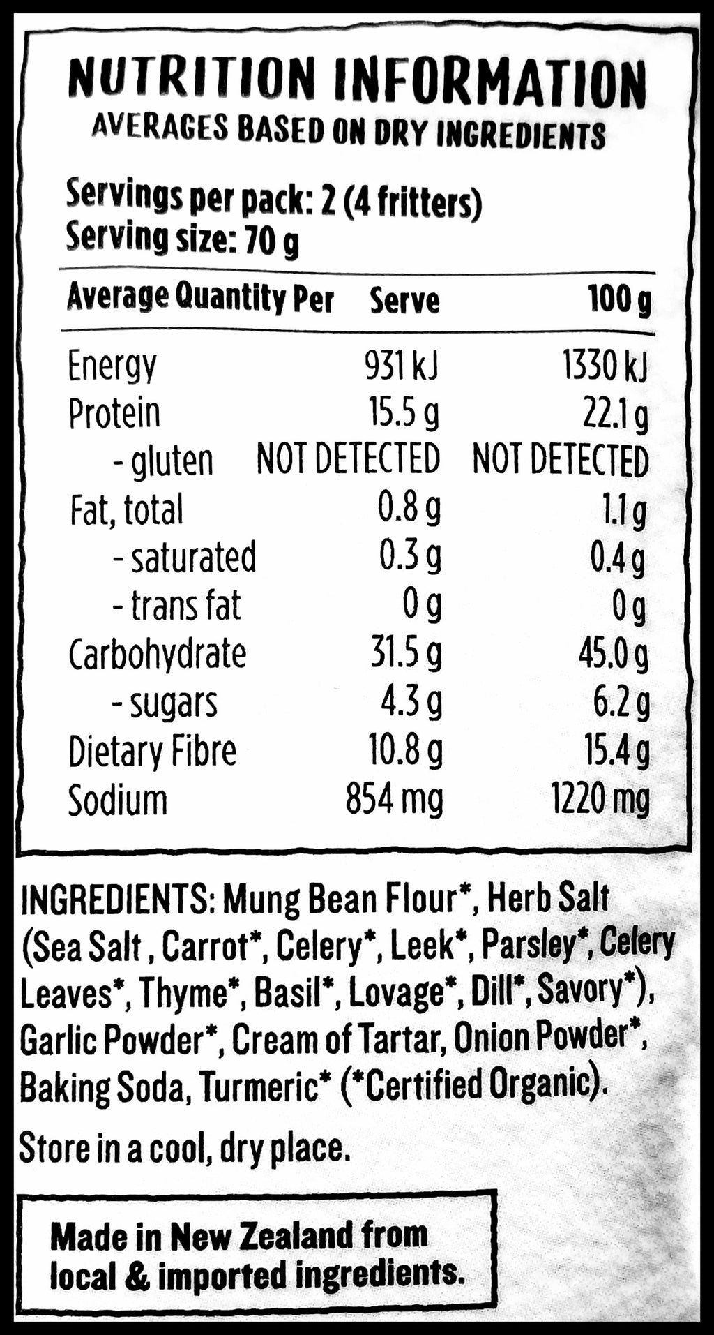 Mung Bean Flour*, Herb Salt (Sea Salt , Carrot*, Celery*, Leek*, Parsley*, Celery Leaves*, Thyme*, Basil*, Lovage*, Dill*, Savoury*), Garlic Powder*, Cream of Tartar, Onion Powder*, Baking Soda, Turmeric* (*Certified Organic).