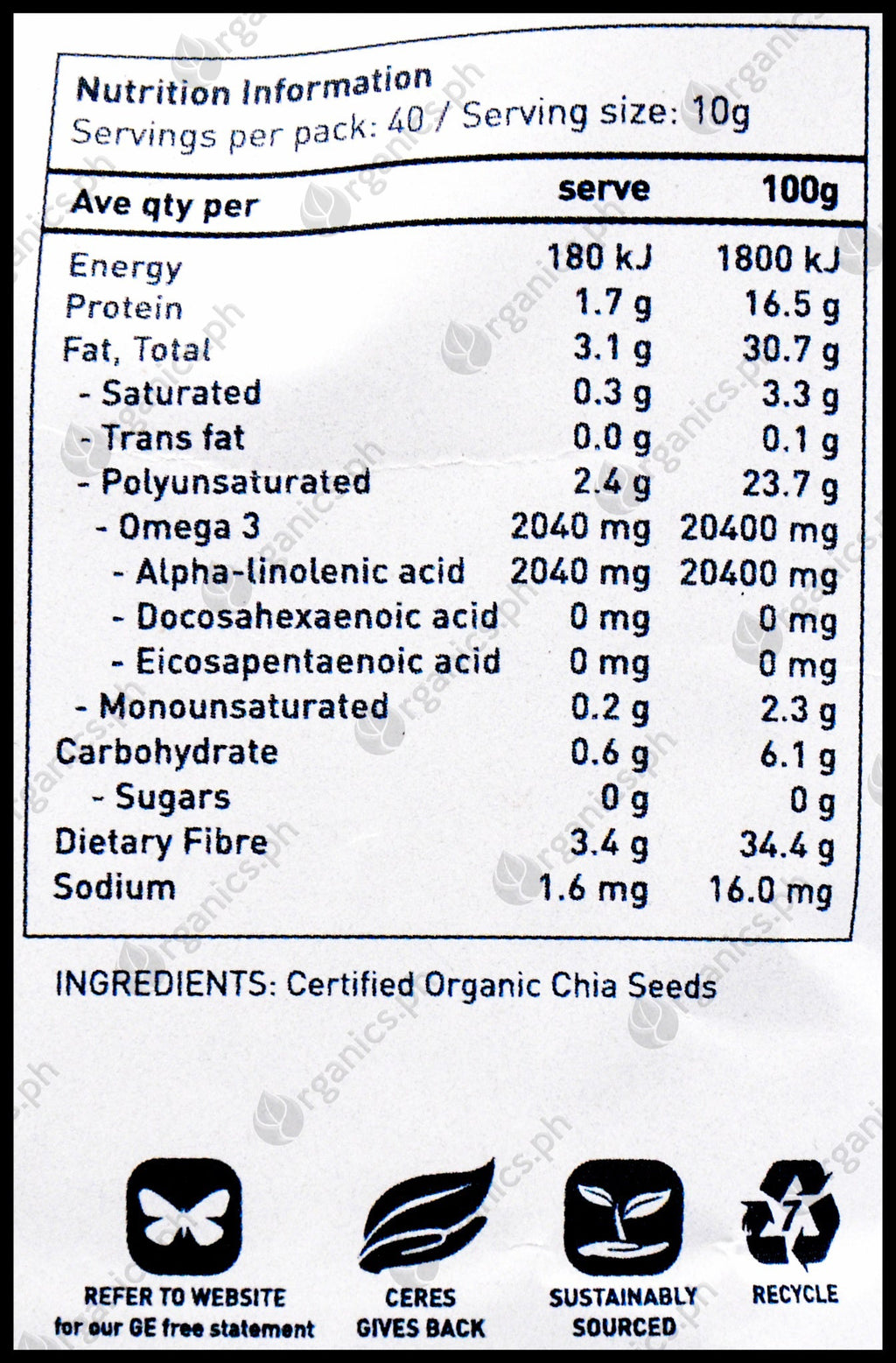 - At Ceres Organics we like things clean and simple. So our chia seeds are just that! Straight up goodness. Loaded with dietary fibre and omega-3, they make a super addition to your daily diet.