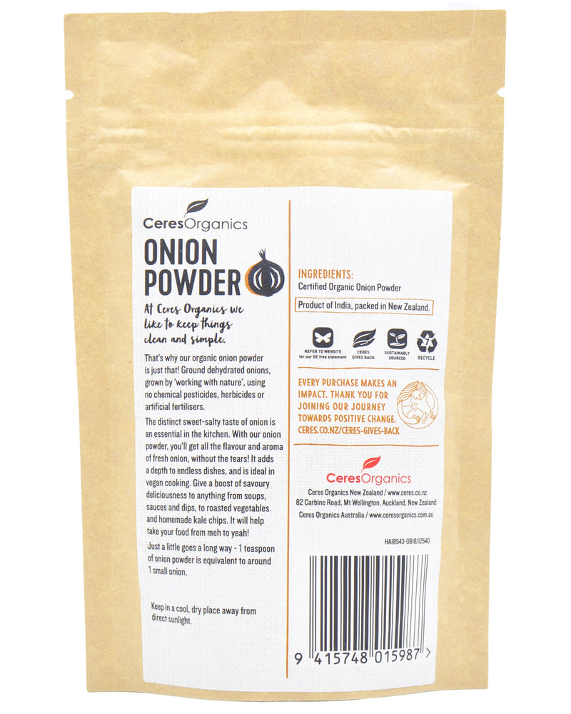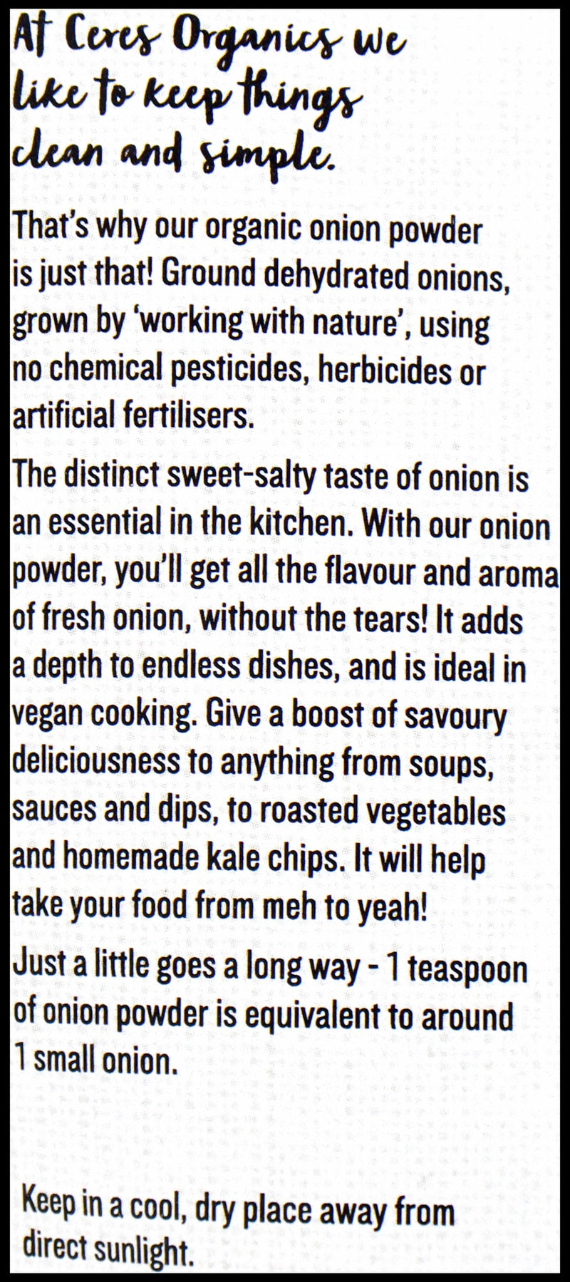 - At Ceres Organics we like to keep things clean and simple. That’s why our organic onion powder is just that! Ground dehydrated onions, grown by ‘working with nature’, using no chemical pesticides, herbicides or artificial fertilizers. The distinct sweet-salty taste of onion is an essential in the kitchen. With our onion powder, you’ll get all the flavor and aroma of fresh onion, without the tears! It adds a depth to endless dishes, and is ideal in vegan cooking.