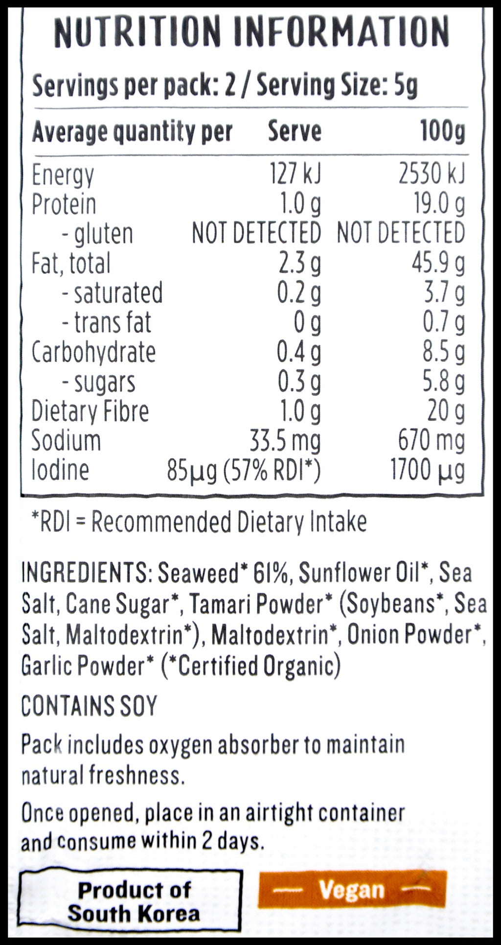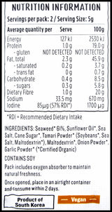 Seaweed* 61%, Sunflower Oil*, Sea Salt, Cane Sugar*, Tamari Powder* 1.5% (Soybeans*, Sea Salt, Maltodextrin*), Maltodextrin*, Onion Powder*, Garlic Powder (*Certified Organic).