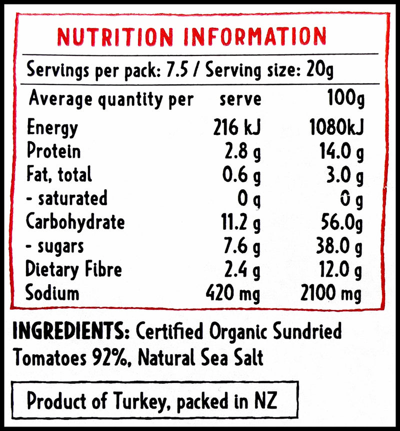 Certified Organic Sundried Tomatoes, Natural Sea Salt.