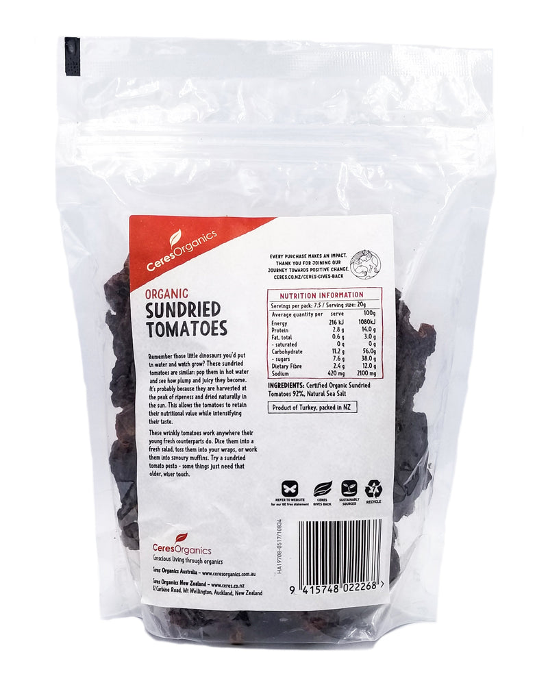 - Ceres Organics Sundried Tomatoes are made of organically grown red tomatoes, harvested at the peak of ripeness and dried naturally in the sun with just a little bit of salt added. This procedure allows tomatoes to retain their nutritional value while intensifying their taste.