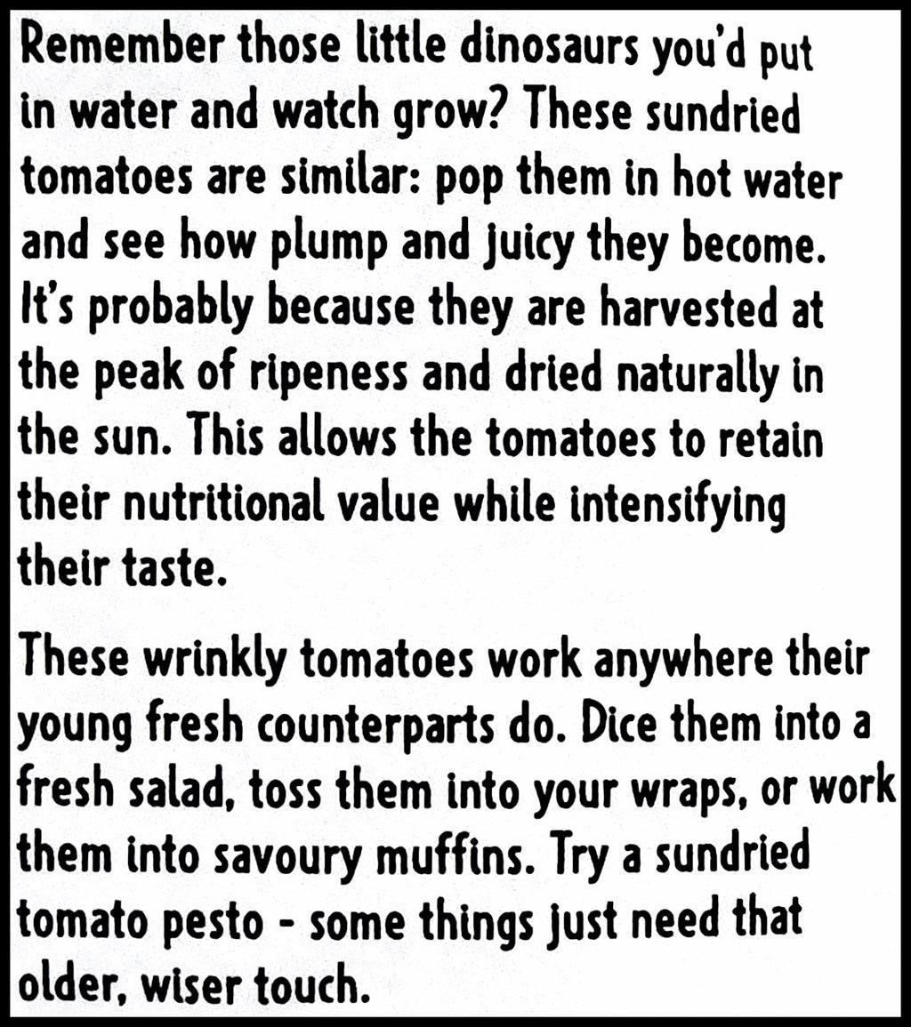 Spice up your next meal with some sundried tomato pesto, or dice them and mix into your cooked green beans or fresh tossed salad. They work anywhere fresh or canned tomatoes do!