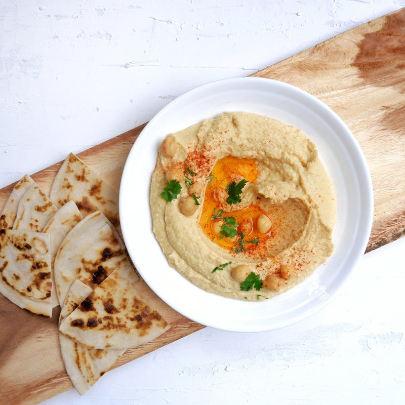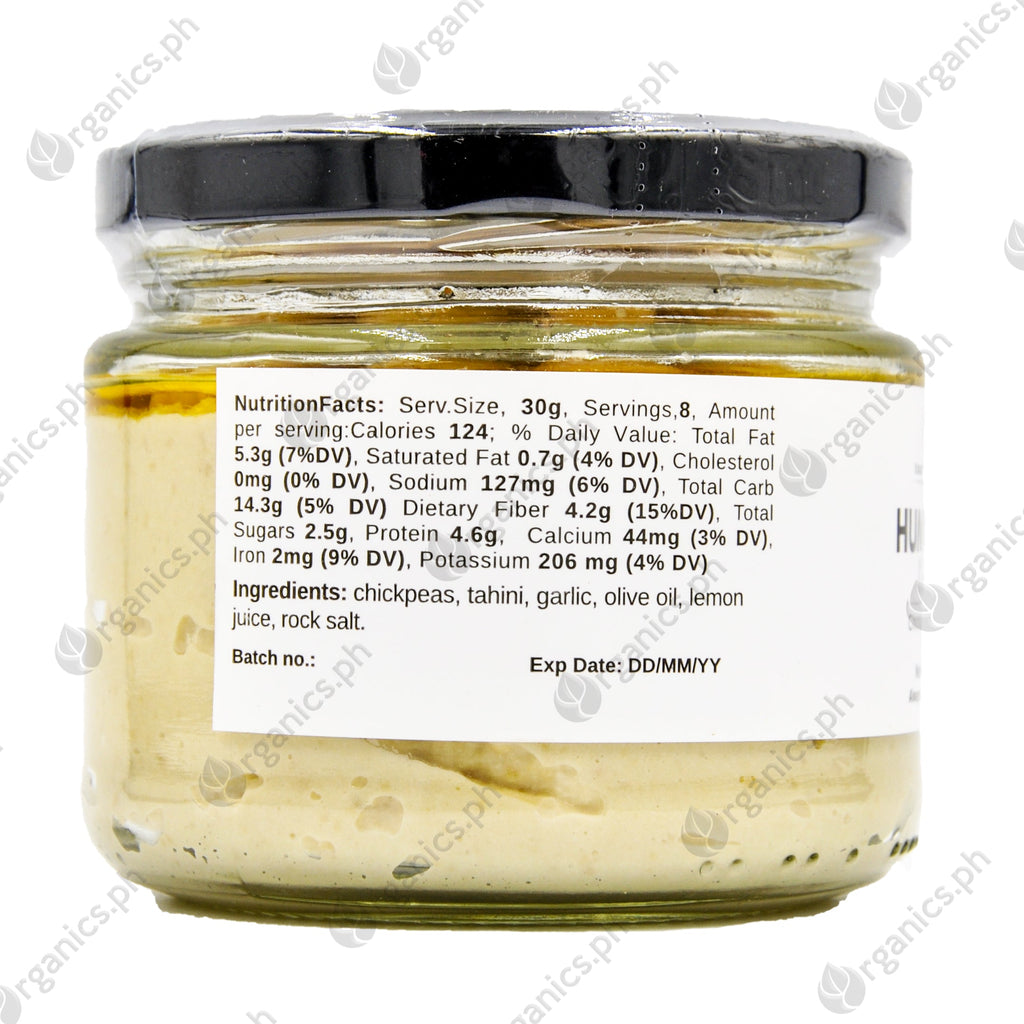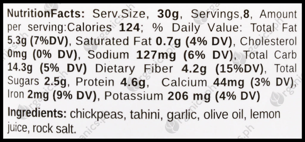 Chickpeas, Tahini, Garlic, Olive Oil, Lemon Juice, Sea Salt.