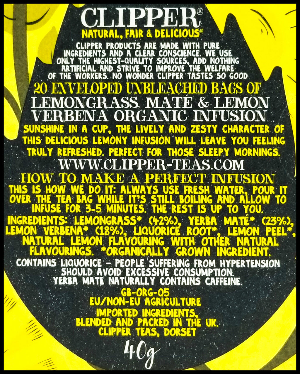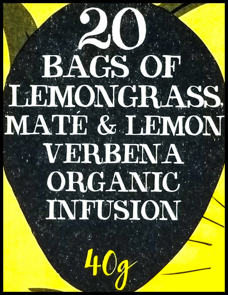 Lemongrass* (42%), Yerba Maté* (23%), Lemon Verbena* (18%), Liquorice root*, Lemon peel*, Natural Lemon Flavouring with other Natural Flavourings.