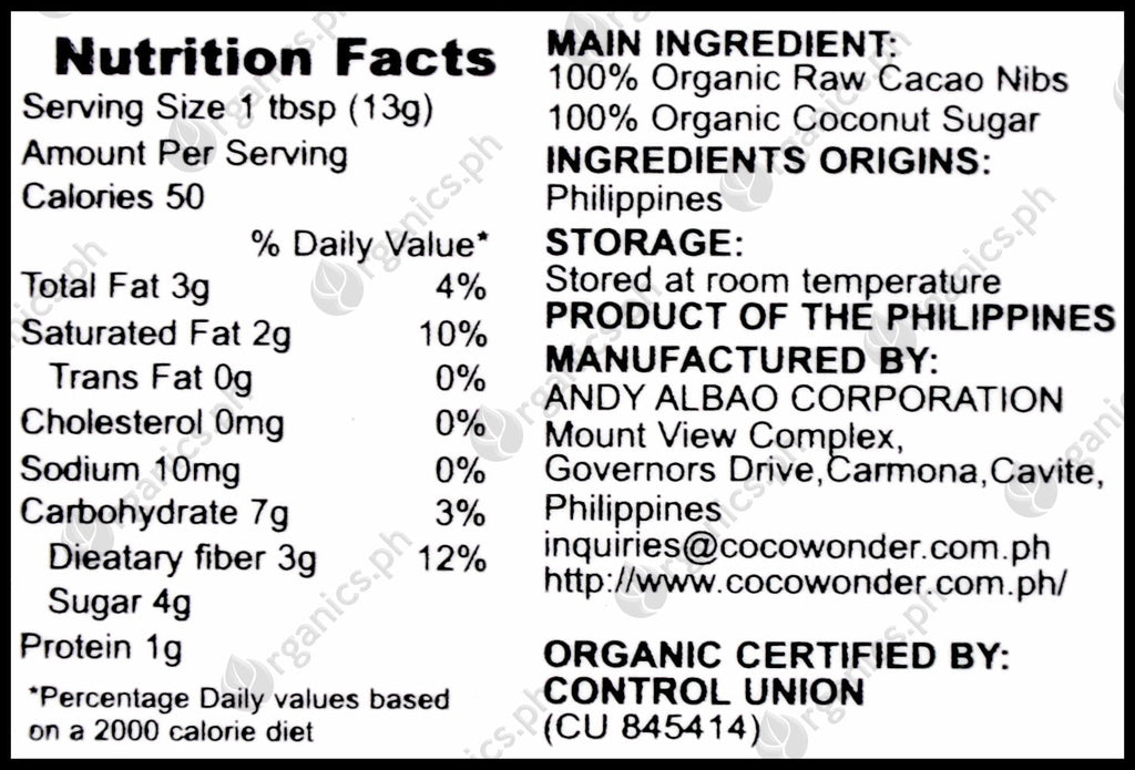 - CocoWonder COCONUT CACAO NIBS are made of premium quality raw cacao nibs and coated with coconut sugar; considered as a Superfood.