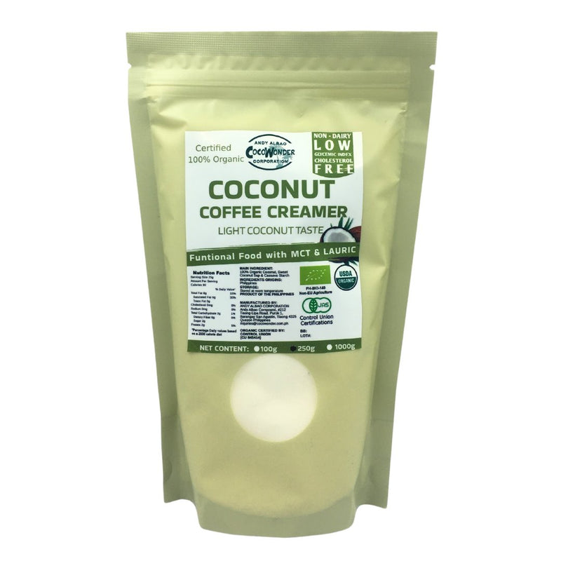 - CocoWonder® Certified 100% Organic COCONUT COFFEE CREAMER has Low Glycemic Index of 35, Gluten Free, Non-GMO and has white to cream color fine powder, no off taste and odor which Classified as Export Quality.