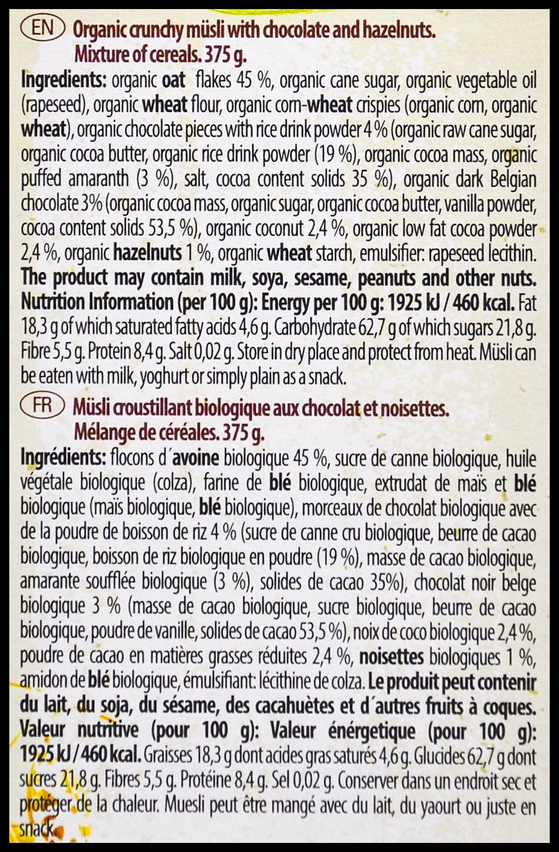 Organic oat flakes 45 %, organic cane sugar, organic rapeseed oil, organic wheat flour, organic corn-wheat crispies (organic corn, organic wheat), organic chocolate pieces with rice powder and amaranth 4 % (organic raw cane sugar, organic cocoa butter, organic rice powder 18 % (organic dried rice syrup, organic rice starch, organic rice flour), organic cocoa mass, organic puffed amaranth 3 %), organic dark chocolate 3 % (organic cocoa mass, organic sugar, organic cocoa butter, organic vanilla powder), organic coconut 2,4 %, organic cocoa powder 2,4 %, organic hazelnuts 1 %, organic wheat starch, extract from organic rosemary leaves (organic sunflower oil, organic natural rosemary extract).