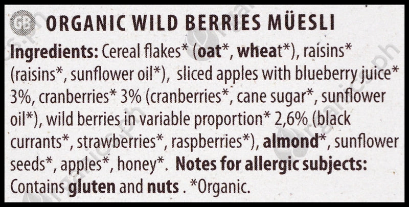 Cereal flakes* (oat*, wheat*), Raisins* (raisins*, sunflower oil*), Sliced Apples with Blueberry Juice* 3%, Cranberries* 3% (cranberries*, cane sugar*, sunflower oil*), Wild Berries (blackcurrants*, strawberries*, raspberries*), Almond*, Sunflower Seeds*, Apples*, Honey*.