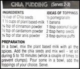 Add to oatmeal, cereal, smoothies, or top yogurt or salads with a sprinkle of chia seeds.  Bake into baked goods like zucchini bread, muffins, and desserts.  Make a chia gel that you can use in smoothies or as a vegan egg replacement in recipes.  Make chia pudding for a healthy breakfast, dessert, or snack.