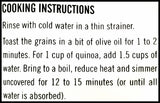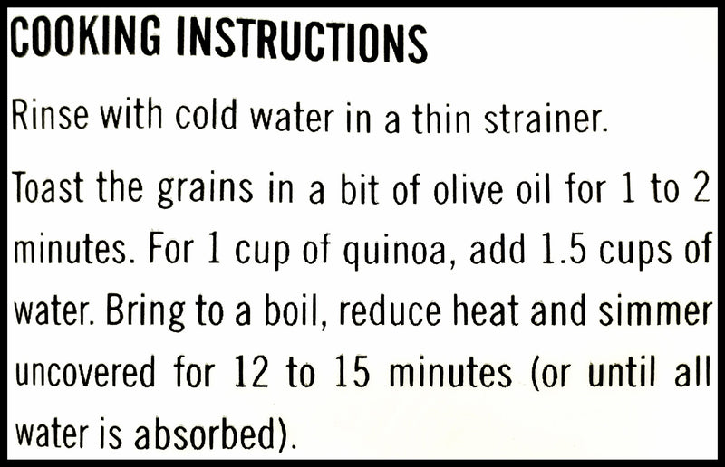 Rinse with cold water. Toast the grains in a bit of olive oil for 1 to 2 minutes. For 1 cup of quinoa, add 1.5 cups of water. Bring to a boil, reduce heat and simmer uncovered for 12 to 15 minutes (or until all water is absorbed).