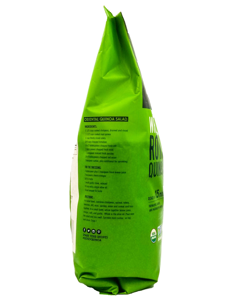 • Royal quinoa is a premium quality seed and is cultivated in the region of Potosi in Bolivia. It is recognizable by its larger grains and its fluffier texture. This superfood, called the mother of all grains in Quechua, is known for its nutritional richness and as a complete plant-based protein!
