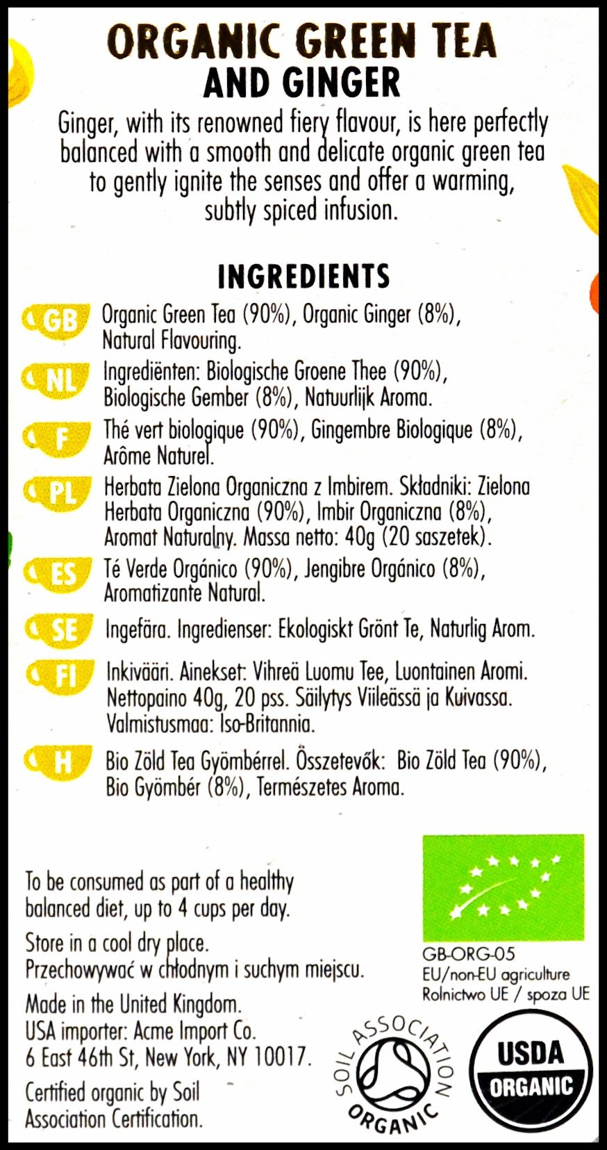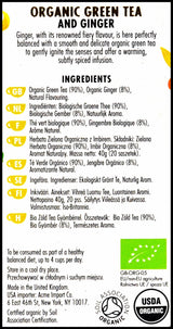Organic Green Tea (90%), Organic Ginger (8%), Natural Flavoring.
