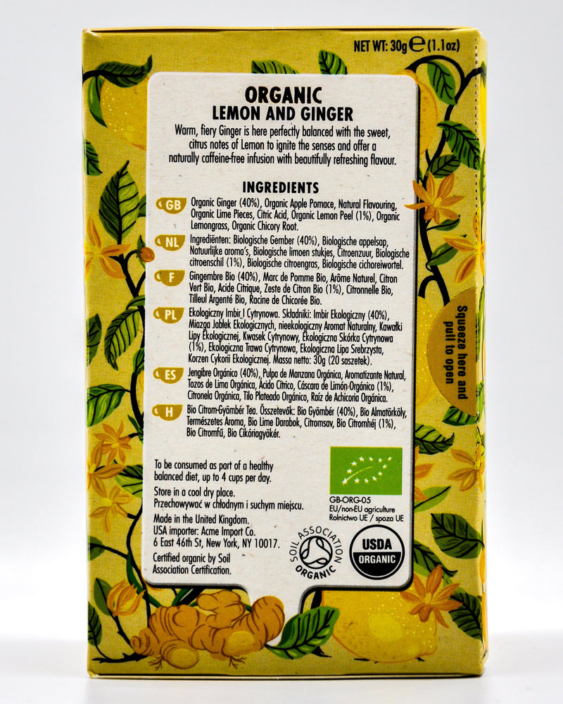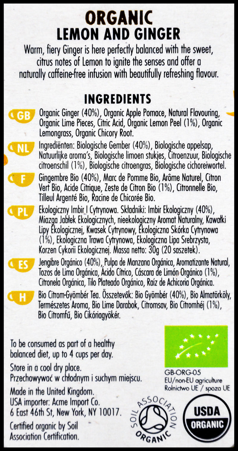 Organic Ginger (40%), Organic Apple Pomace, Natural Flavouring , Organic Lime Pieces, Citric Acid, Organic Lemon Peel (1%), Organic Lemongrass, Organic Chicory Root.