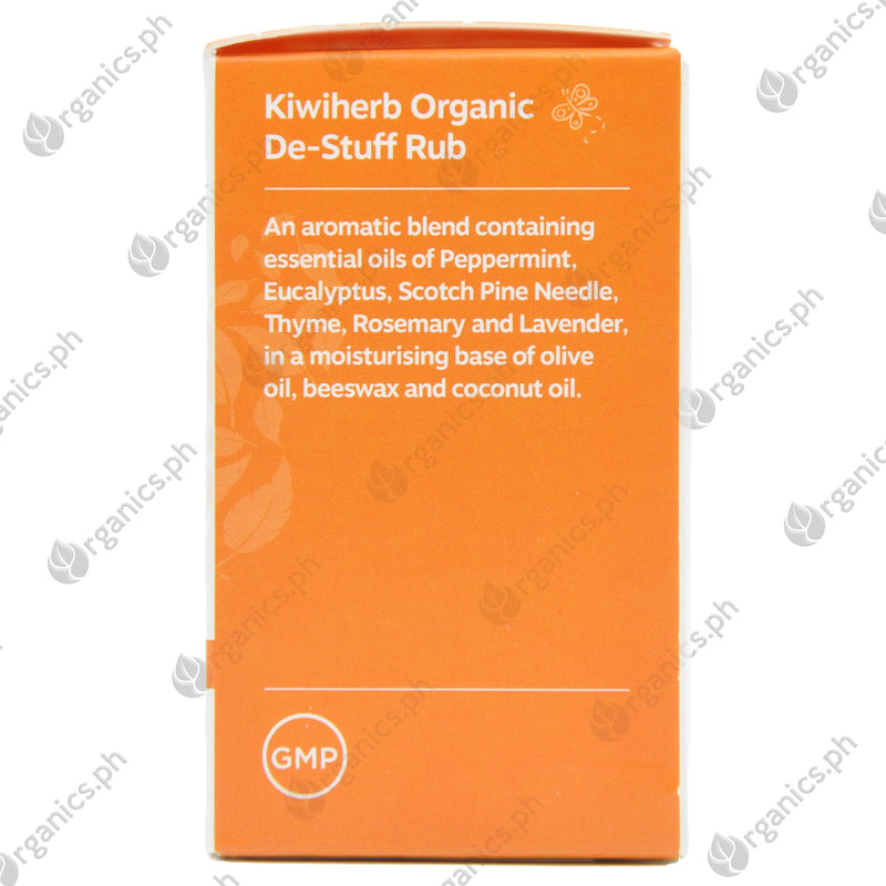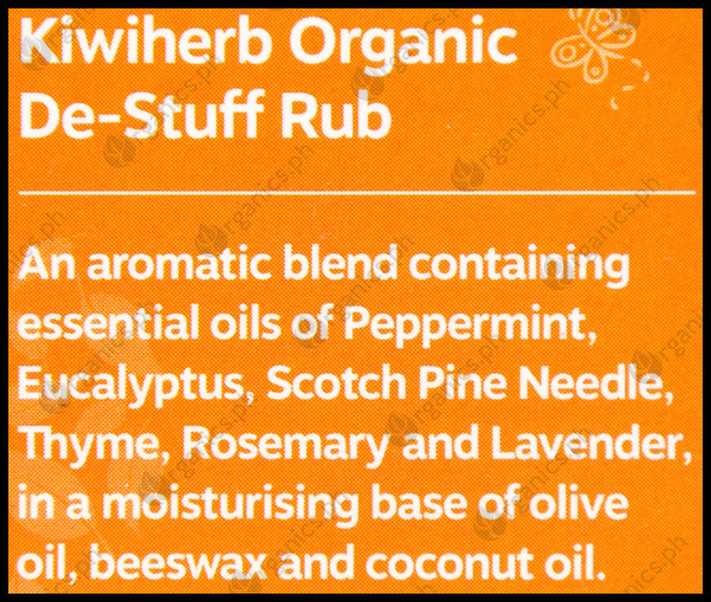 - De-Stuff Rub is a certified organic blend of six essential oils, including Peppermint, Thyme and Eucalyptus in a moisturizing base of cold pressed Coconut Oil, Olive Oil and NZ Beeswax.