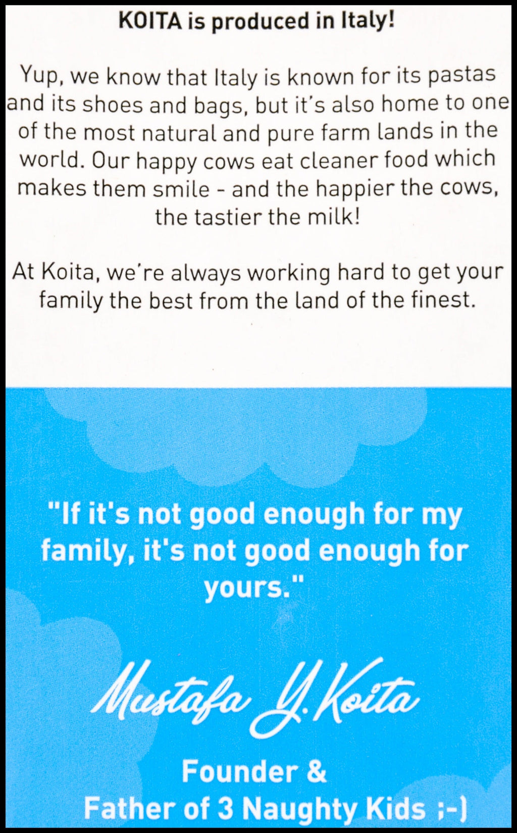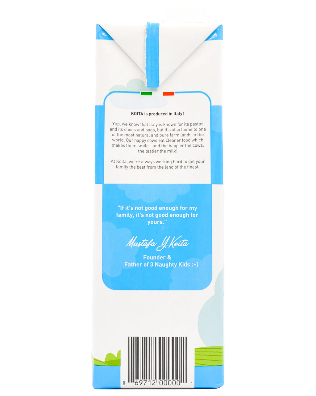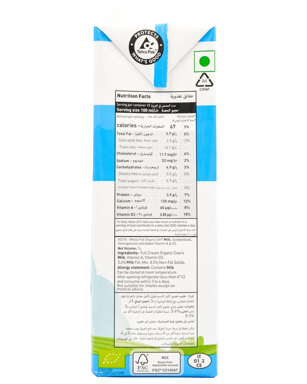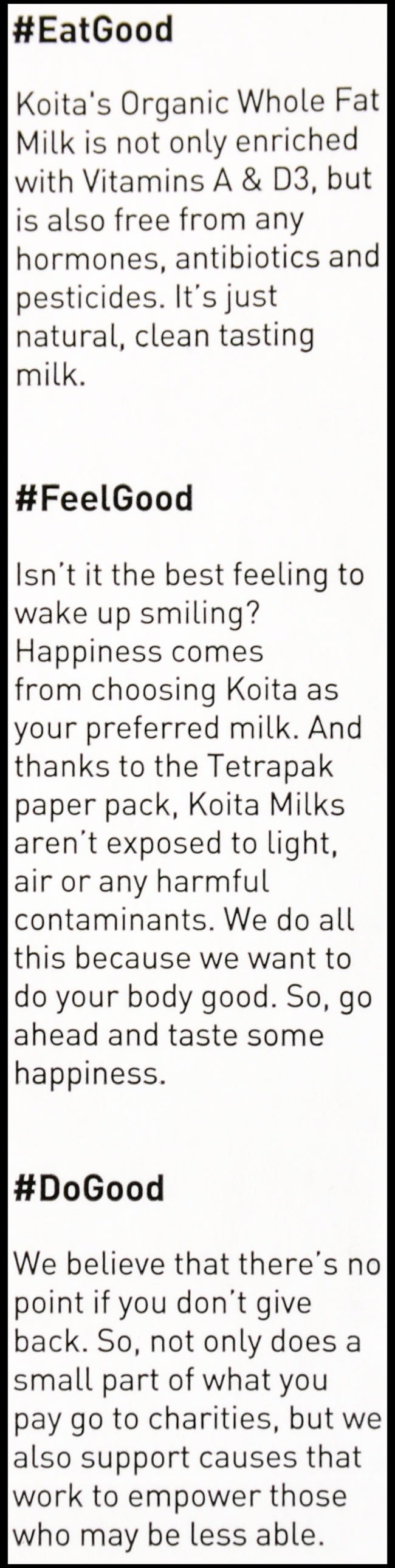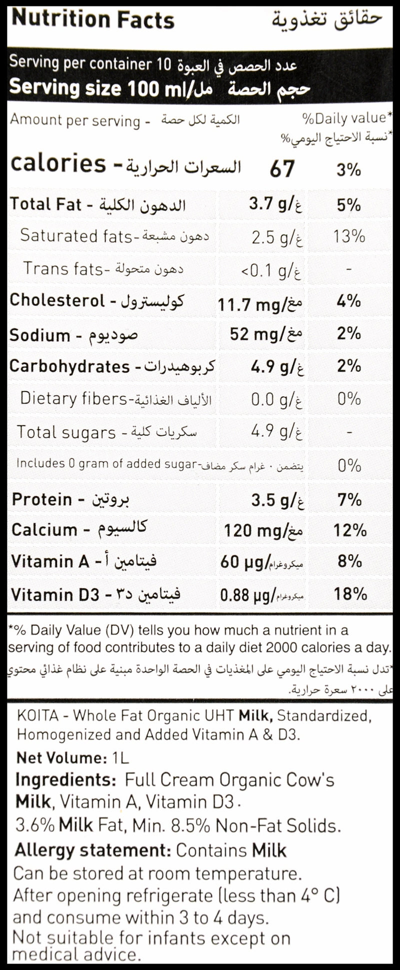 • We can’t bring you closer to the cow than Koita’s Whole Organic Milk. This is great for the little ones in the family who need healthy fat content (3.6%), the creaminess, and the rich texture that comes from loaded nutrition. Vitamins A and D3 are also found in our organic milk range for added nutrition per cup!