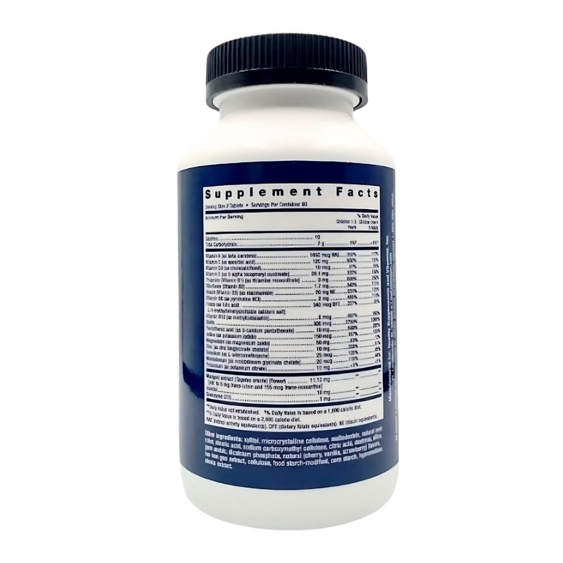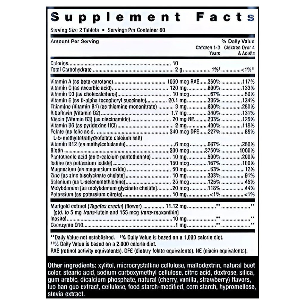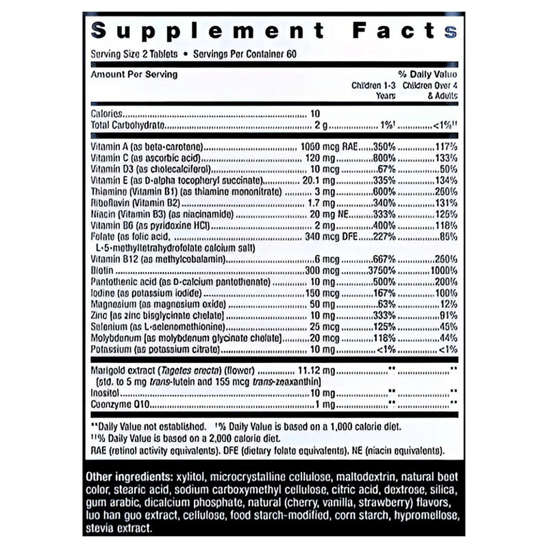Vitamin A (as beta-carotene) 1050 mcg RAE, Vitamin C (as ascorbic acid) 120mg, Vitamin D3 (as cholecalciferol) 10mcg, Vitamin E (as D-alpha tocopheryl succinate) 20.1mg, Thiamine (Vitamin B1) (as thiamine mononitrate) 3mg, Riboflavin (Vitamin B2) 1.7mg, Niacin (Vitamin B3) (as niacinamide) 20mg, NE, Vitamin B6 (as pyridoxine HCI) 2mg, Folate (as folic acid, L-5-methyltetrahydrofolate calcium salt) 265 mcg DFE, Vitamin B12 (as methylcobalamin) 6mcg, Biotin 300mcg, Pantothenic acid (as D-calcium pantothenate) 10mg, Iodine (as potassium iodide) 150mcg, Magnesium (as magnesium oxide) 50mg, Zinc (as TRAACS zinc bisglycinate chelate) 10mg, Selenium (as L-selenomethionine) 25mcg, Molybdenum (as TRAACS molybdenum glycinate chelate) 20mcg, Potassium (as potassium citrate) 10mg, Marigold extract (flowers) [std. to 5 mg trans-lutein and 155 mcg trans-zeaxanthin] 11.2mg, Inositol 10mg, Coenzyme Q10 1mg.